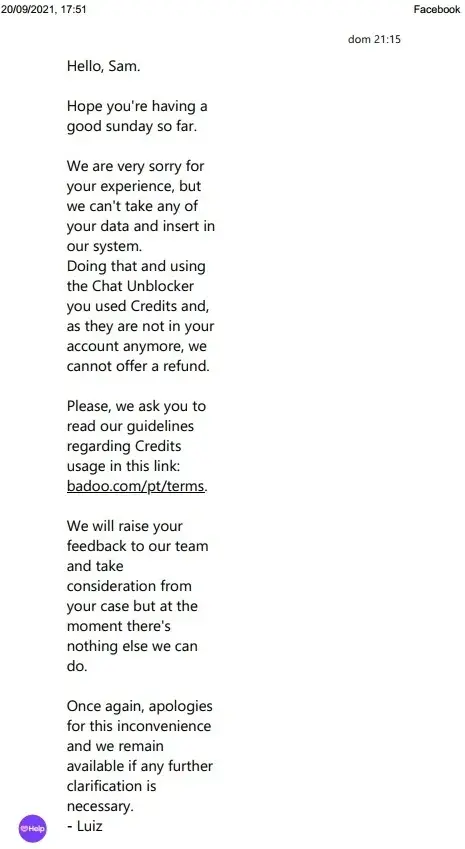 I did not authorize; I did not accept, and I did not order the purchase of (what you call) services (which I reject to call it services because they are not in conformity with any kind of agreements, in your response to me in Facebook messenger you referred to what you terms as “Chat Unblocker” in your latest response, which is not in conformity with any kind of agreements in your terms and conditions, see the attached screenshot), and you (www.badoo.com) did not have my permission to proceed with those meaningless purchases of something virtual that does not exist in reality, something that I have never ordered from you (what you called “Chat Unblocker” service in your latest response to me in Facebook Messenger, which is ambiguous and not in conformity with any of your terms and conditions).