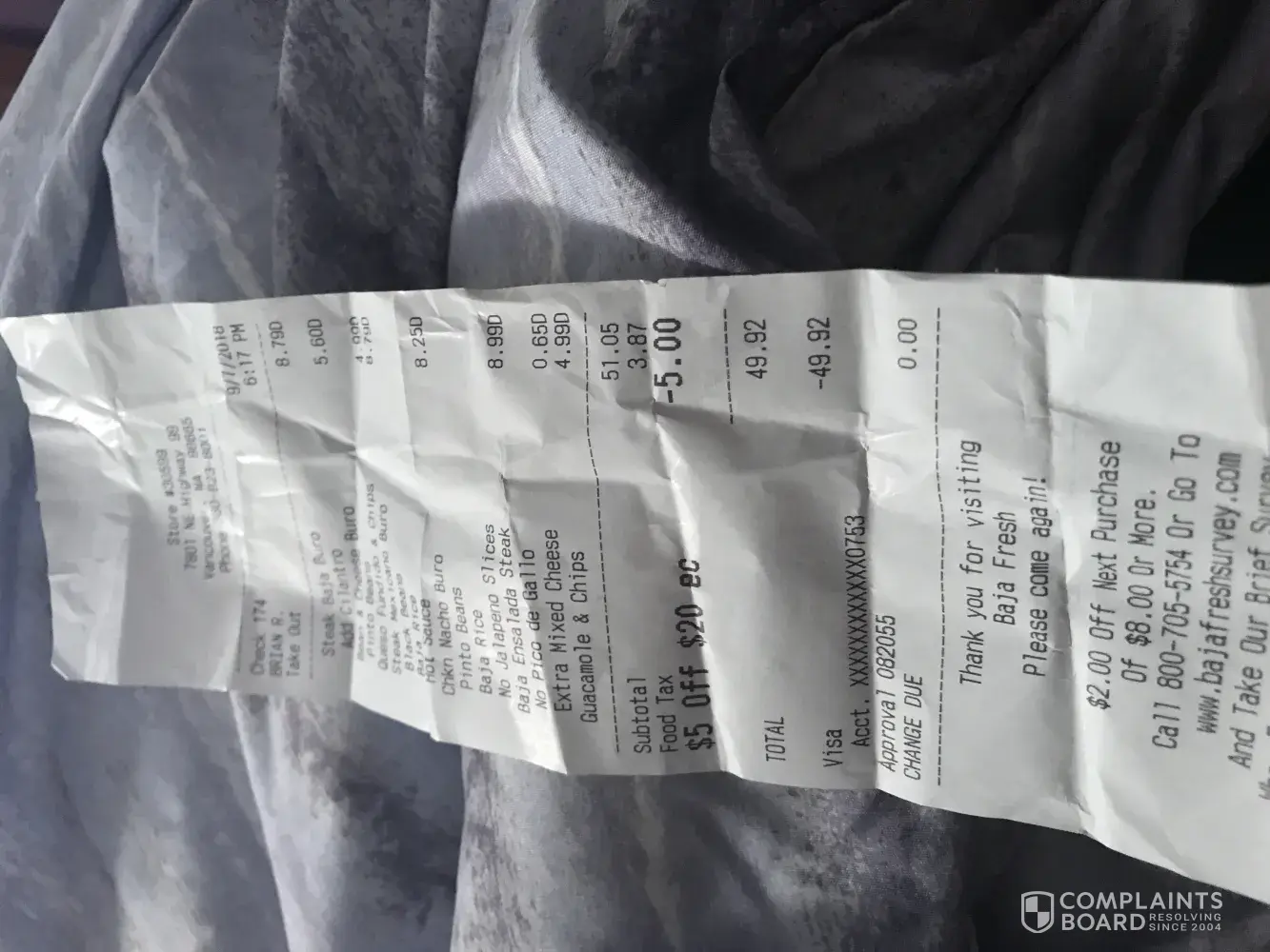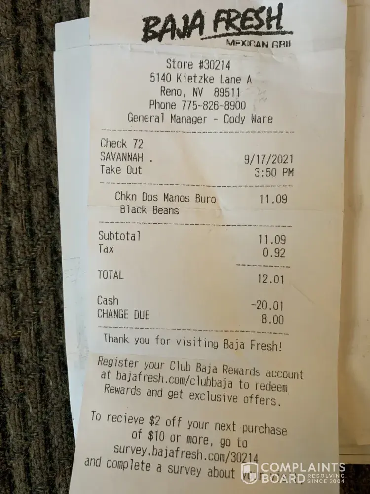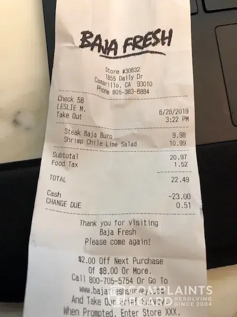 Read full complaint and 5 commentsBaja Fresh complaints: history and resolution overview