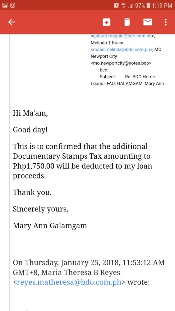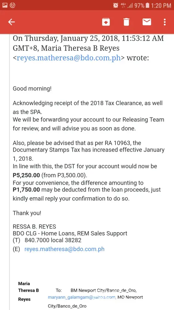 My sister, Mary Ann C. Galamgam who is an OFW applied for a home loan last year to BDO Newport Office and she appointed me as her Attorney-in fact. Last year we were able to complied with all the requirements and paid the necessary bank fees except for the 2018 Tax Clearance because Registry of Deeds doesn't want to issue one so we have waited until 2018. Last January 25, 2018 we received acknowledgment receipt for all the compliance that are lacking and confirmed on the additional documentary stamps tax due to Tax changes. I was able to confirmed in the e-mail came from Ms. Maria Theresa B. Reyes. However from then on I haven't received any information or what on the status of my sister's loan. No one from the group could even bother to reply my e-mail except to Sir Christian Carpio (who has giving false hope). I have been calling Ms. Reyes but not one did she bothered to answer my call or e-mails to her. Please help us. Give us at least verified information on the status of my sister's loan or at least give us the waiting time.