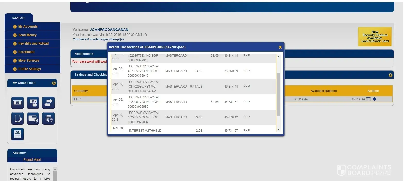 Yesterday April 2, 2018, when I check my online banking, I found out that there is 9, 417 Php deduction on my saving using PayPal and it was used on the same date April 2, 2018, with the details: POS W/D SV PAYPAL (CI [protected] MC SGP [protected].