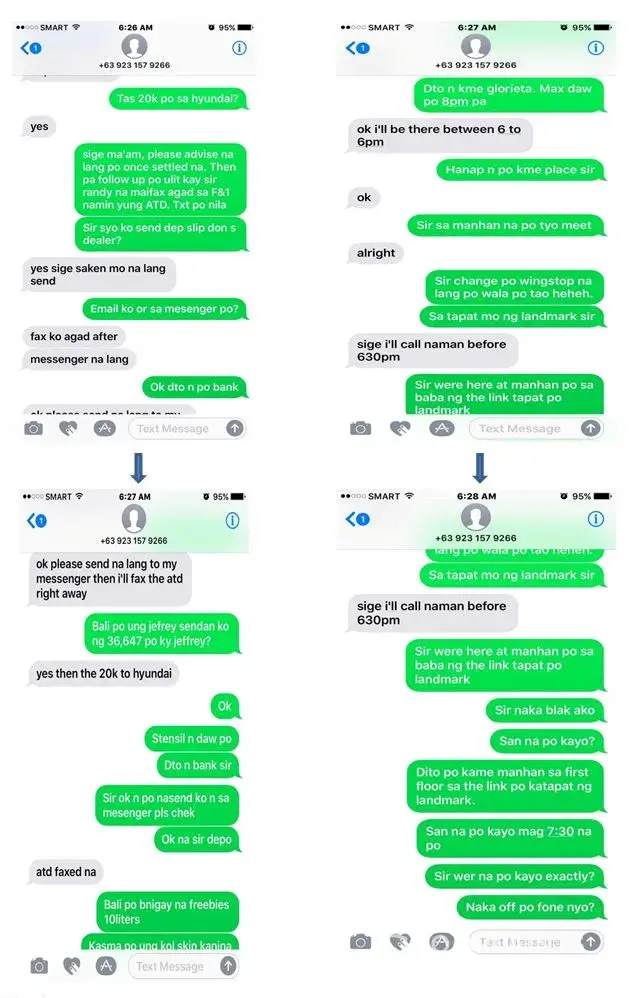 After we have sent the photo copy of the deposit slip, we were supposed to meet with Mr.Randy Maranan to fill up the Deed of sale with assume responsibility, SPA, checks for the monthly amortization, etc. After waiting for an hour, he was no longer responding thru text and when we called, his phone is already unattended and this is when we realized we have been scammed.