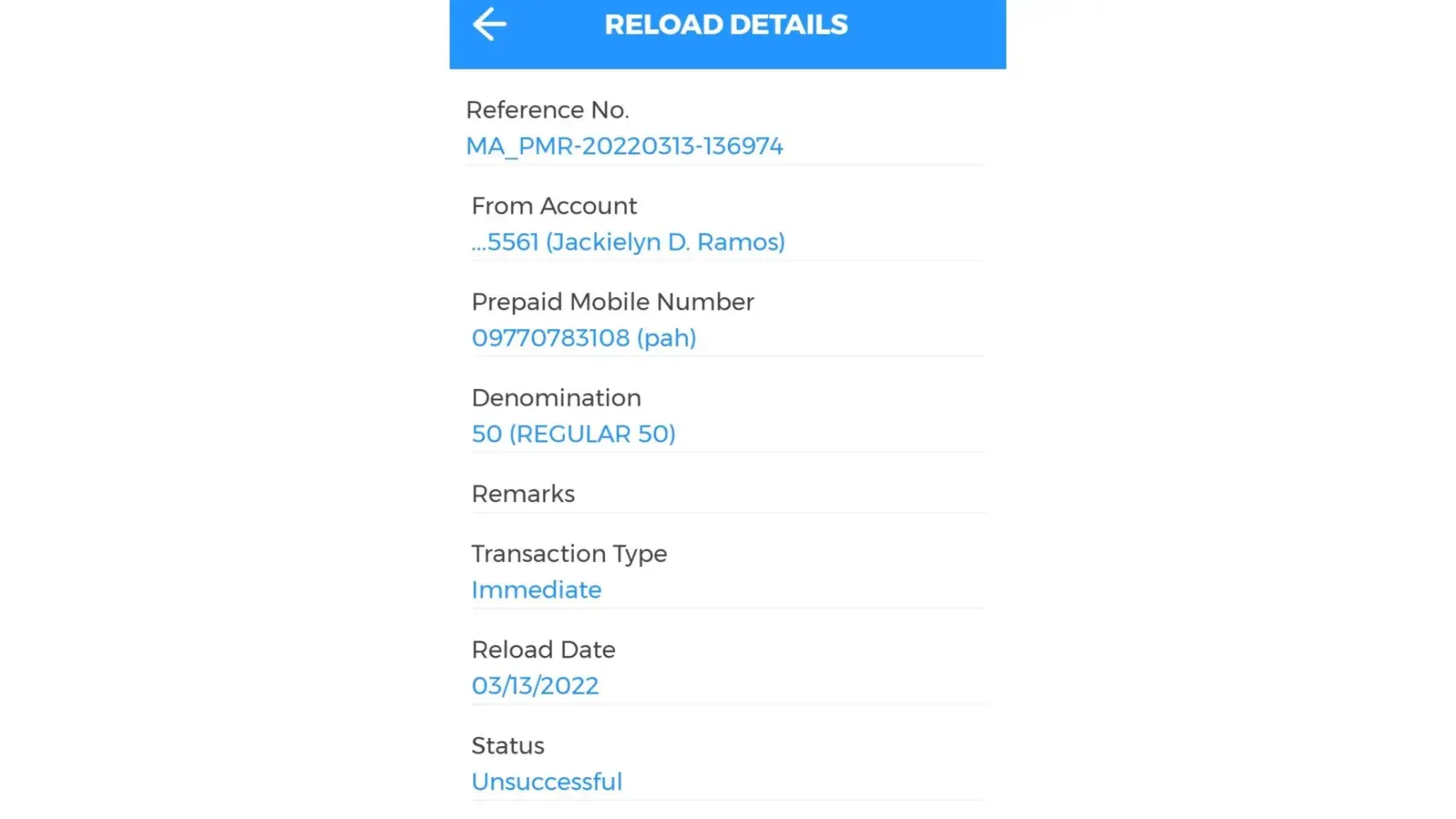 I loaded 50 pesos. It said it was unsuccessful and I have to go back after 1 hour. I checked my balance and 50 pesos was really deducted even though I didn't receive any load.