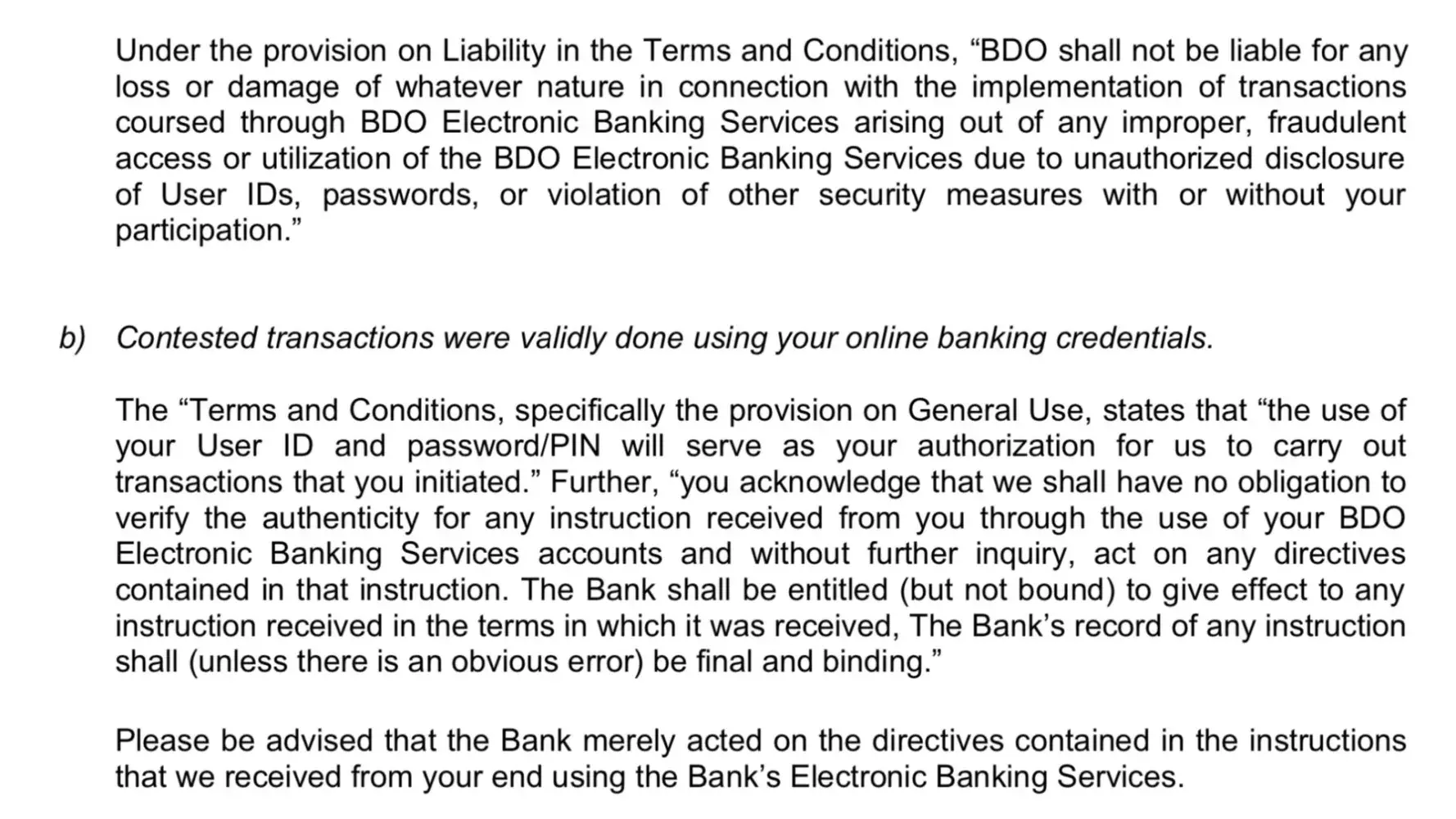 Several irregularities and actions were lapsed by BDO. It is their obligation to take care and be liable for this incident. They must be responsible for any loss of their client because of their poor system. BDO is a huge company and must have the best and responsible it experts. They must also have responsible officers and staff to take care of their clients... We are customers, we deserve fair treatment...