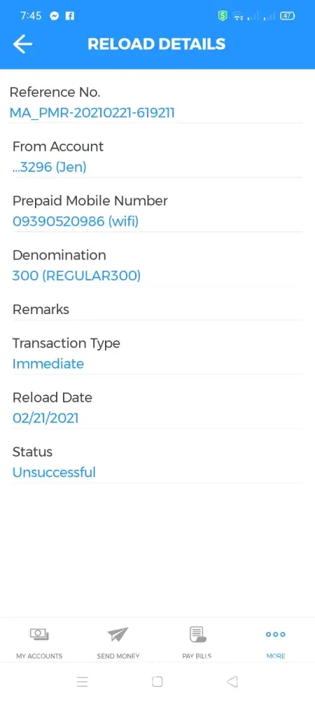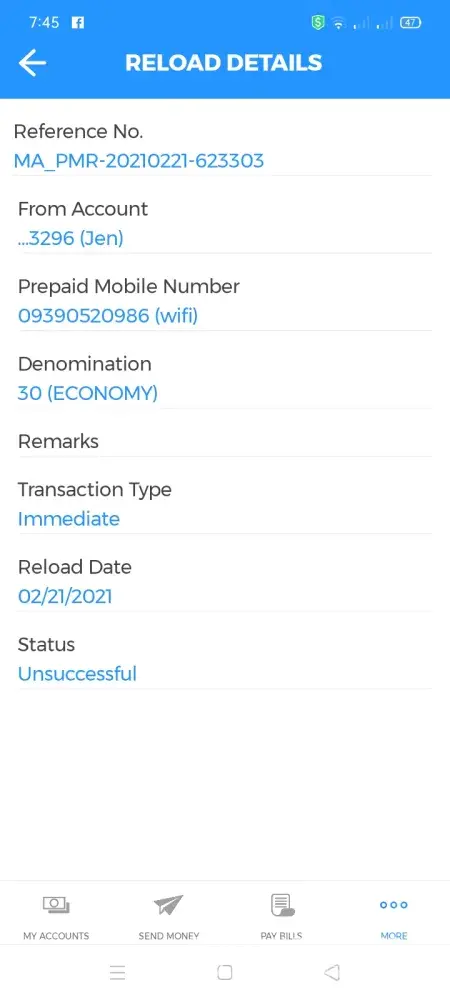 Unsuccessful prepaid load