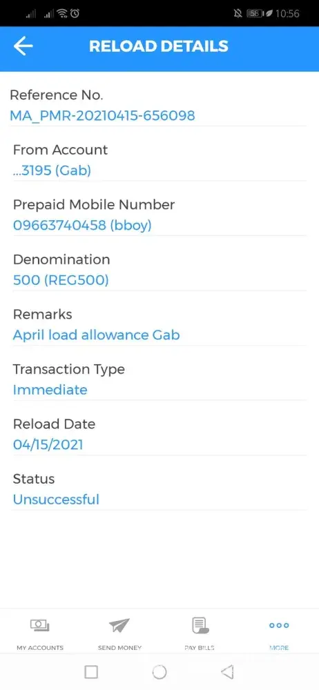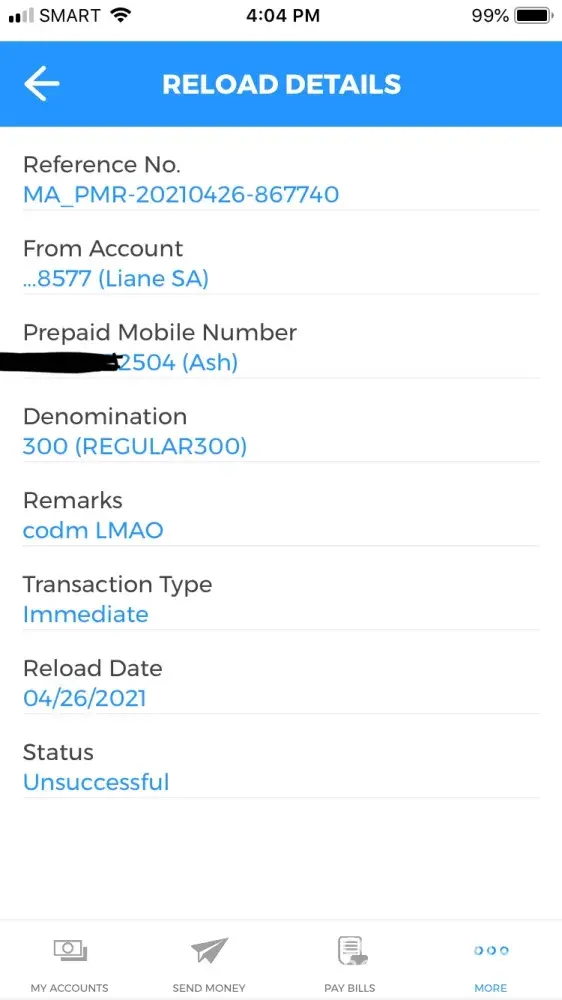 I attempted reload 500php to my prepaid mobile number [protected] using my BDO app in April 15, 2021 at around noon time.