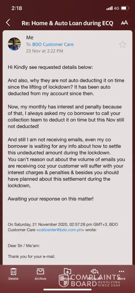 It started on the lockdown period whereas they were not able to deduct the Auto loan payment for 2 months from my account now I am being deducted with interest & penalty charges which is not my fault. However, due to this pandemic lockdown, I asked thru email last June 9 on how to settle those months that were not deducted from my account during the ECQ or...