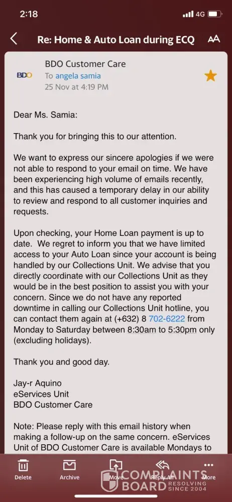 1. After my 2 email to Ms Jessica dela Cruz with NO REPLY, on Oct 1, 2020 @ 11:07am finally endored and informed Ms Manalili to assist us in our loan account.