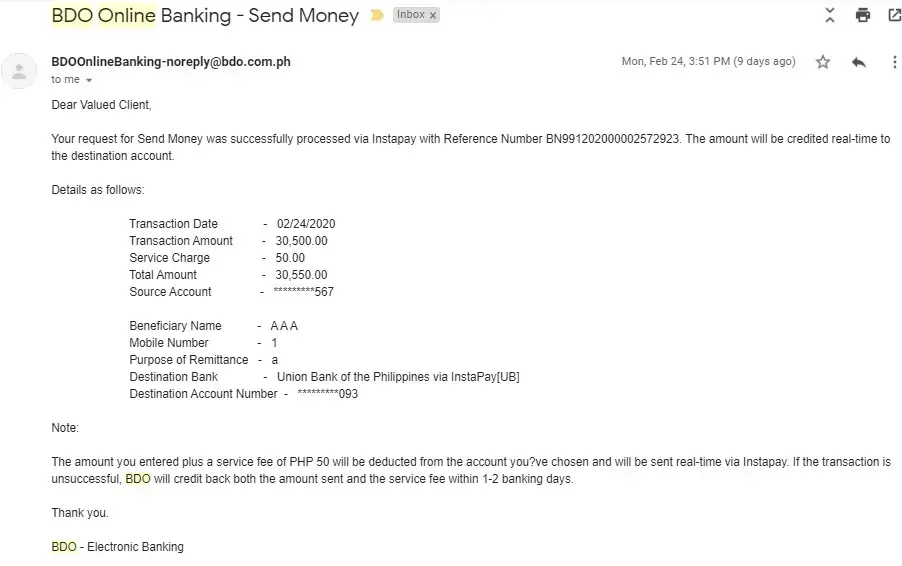 After few days follow up again then advise me that I should go to bank branch to get the letter sent a days ago, which that the email advise my that day is it still on process. And telling me that they can't retrieve it due to INSTAPAY transfer.