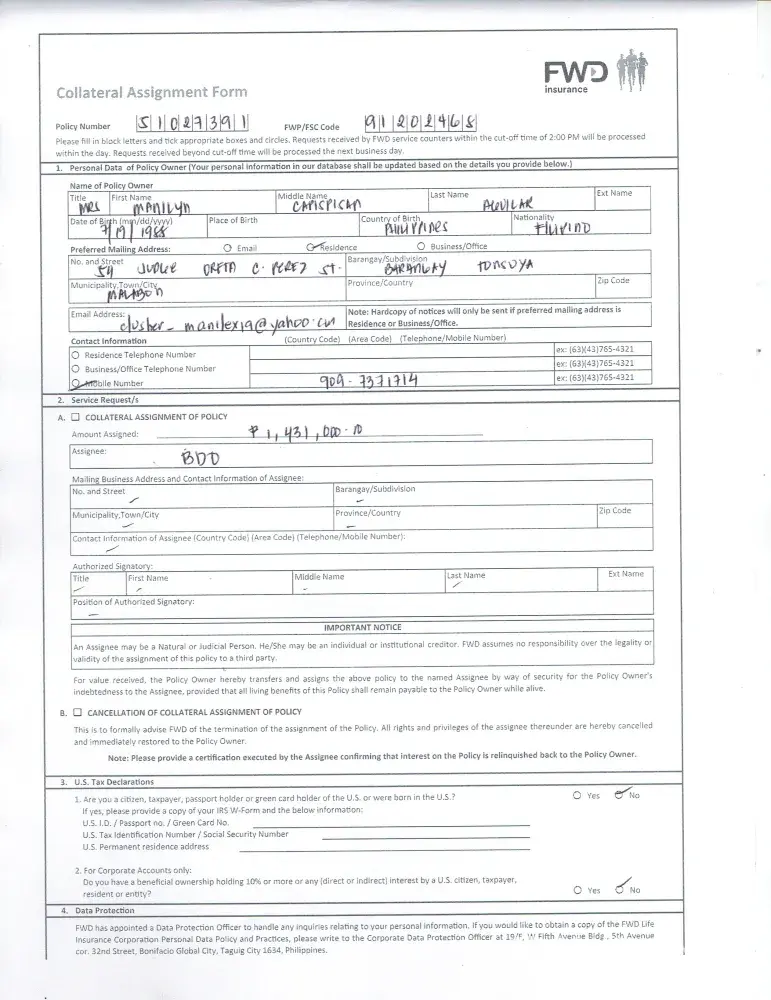 Poor service in the insurance, in this matter, already email the bso insurance regarding of my insurance in home loan., I told them that I will not continue my insurance with your bank, all I need is to sign this collateral form. Of assignment of account officer so that my insurance (fwd) will provide the endorsement letter under the name of bdo for my home loan. They always response is I will bring this concern to our officer thats all.. I'd email them 1st week of the month with the attachment of this letter and my policy number receipt.. Someone called me yesterday, she insisted that im not allowed to get other insurance unless I paid the total amount of my my mri for 15 yrs? How come? And she told me that my insurance will be expire so I told her I already submit the documents, and I am waiting so long for the signature I need.. As far as im concern I ask do branches and they told me that I can get any insurance as long as it is life insurance, the bdo need to certify only the documents. How long I will wait for the signature?