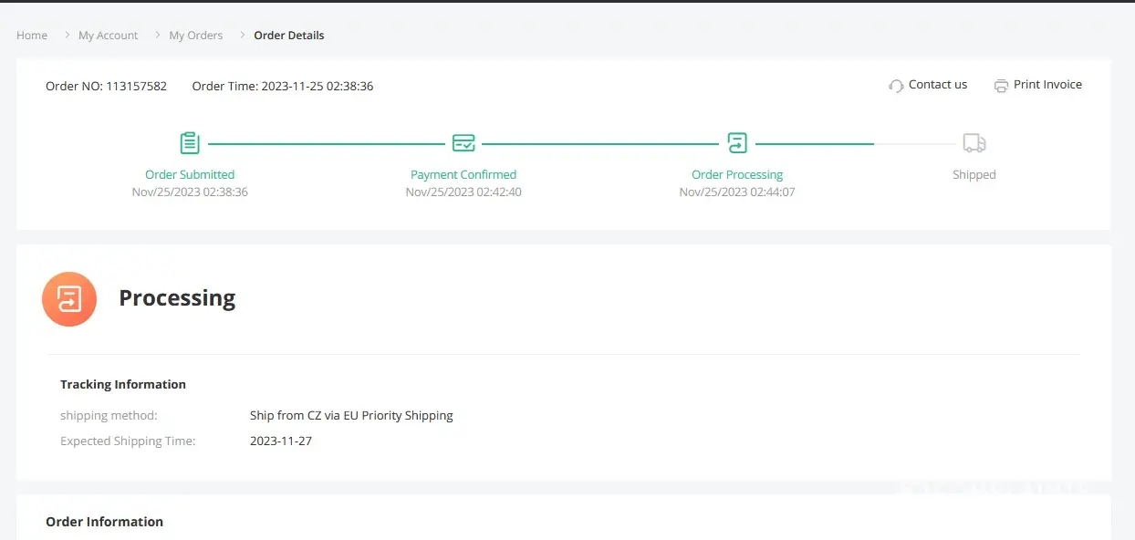 I ordered a 3d printer on Nov. 11, 2023 at 02:38:36 and paid using paypal. The payment was acccecpted Nov. 25, 2023 at 02:38:36.The printer was in stock and expected shipping Nov. 27, 2023 with 5 days delivery should've arrived before St. Nicholas as a gift for my child. Since the purchase, the status showed "Order Processing". I contacted banggood on Nov. 29, 2023 at 07:34:04 via chat and I was assured this way "Please do not worry our team try its best to resolve this issue soon." "... soon" on Nov. 29, 2023 status was still unchanged. So again I've contacted at 07:28:35 via chat and received "I would like to inform you that your order is processing and the expected shipping date is 2023-11-30." and "Please do not worry our team is trying its best to resolve this issue soon.". Nov. 30, 2023 at 19:40 order status has changed to "Our warehouse has started packing your items." so I asked in chat "How can you pack a package that is already packed by the manufacturer?" and received the answer "We have to check the order status with the warehouse team so, we have already shared your order details with the warehouse team to check, they will check and email you in 24 working hours with the order details." Guess what? Today Dec. 3, 2023 20:07 CET and my order status is still showing "Our warehouse has started packing your items."