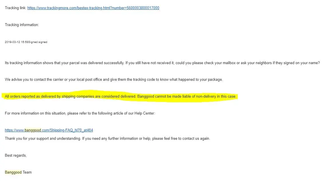 They are simply saying again and again the following - "All orders reported as delivered by shipping companies are considered delivered. Banggood cannot be made liable of non-delivery in this case."