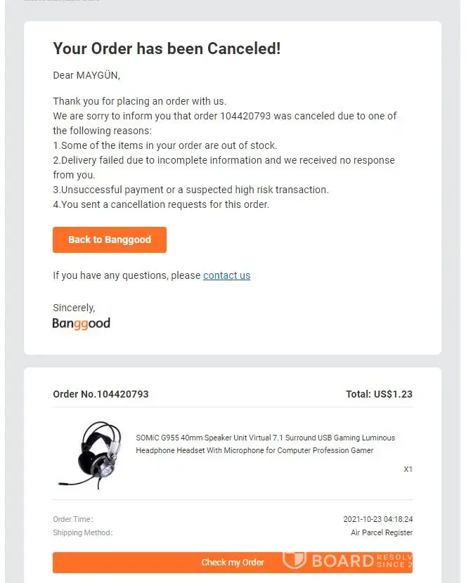 I placed an order with the order number [protected] for the product I won from bangood's slash application on 23/11/2011. Bangood canceled my order on 06/11/2021 without giving any valid reason. Slash product application is an application made by bangood and I earned my product from this application.