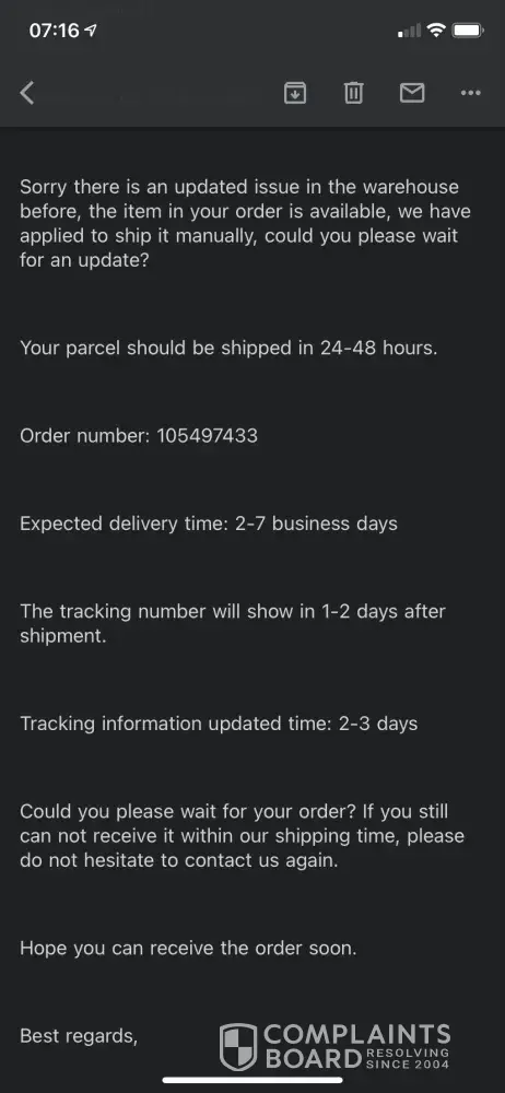 1st reply said they had a problem in the warehouse and I should wait up to 48hrs for shipping manually.