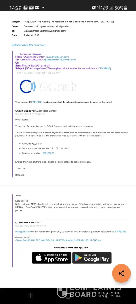 My order is still marked as pending payment even when proof of successful payment was emailed already. I have sent several emails to [protected]@banggood.com & [protected]@banggood.com to follow up but I am yet to receive a response. Order details are as follows: order no [protected]. Payment was made via Gcash. Attached are the screenshots of the 1) email from Gcash confirming the successful transaction, and 2) receipt generated from the Gcash app after payment.