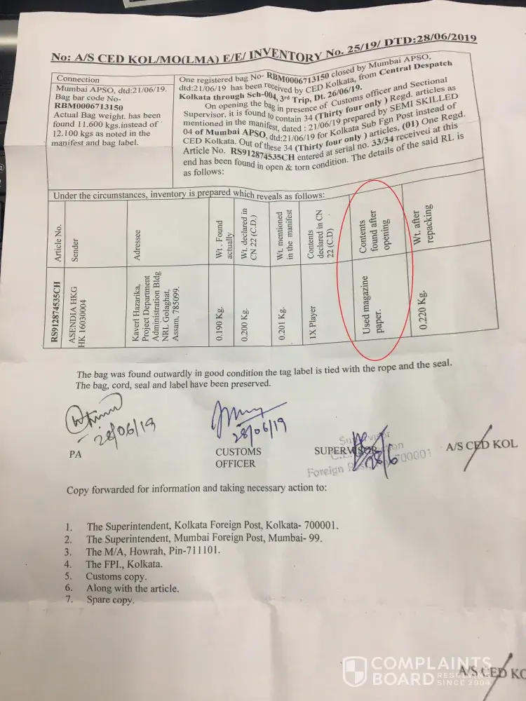 On 8th Jul' 19, I received the package with item missing. There was a folded magazine inside instead of the ordered item. Also, there was a note from the Customs Officer (Kolkata) wherein it is clearly indicacted that there's mismatch in contents declared versus contents actually found.