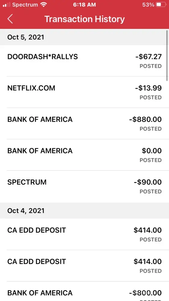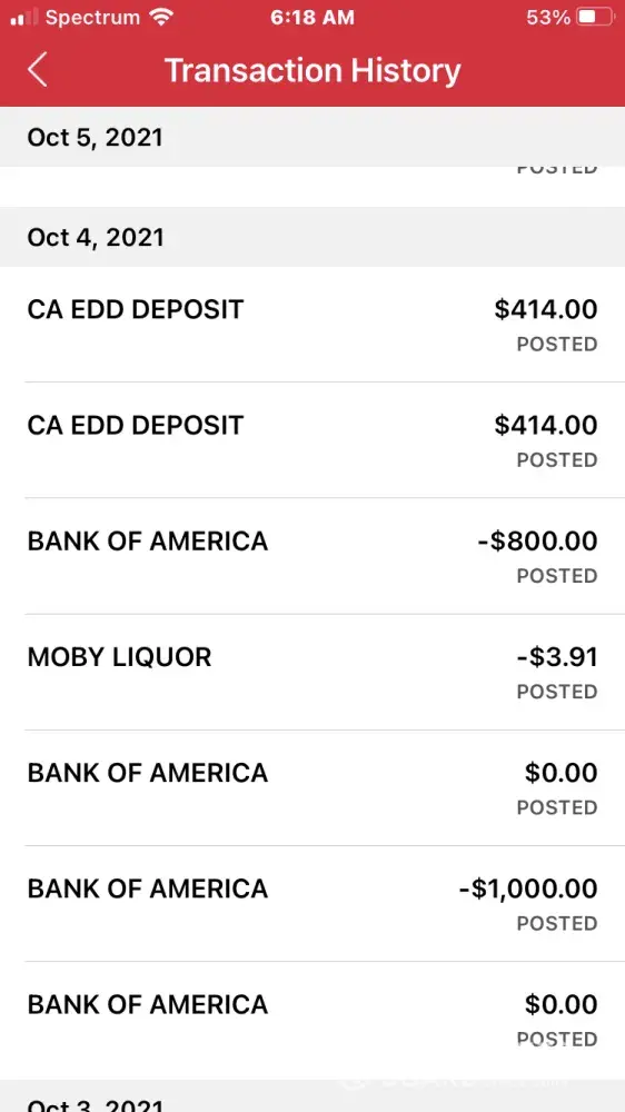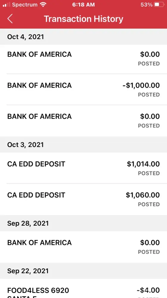 EDD deposited 2 payments on October 3rd for the amount of $1060 and $1014 and 2 payments on October 4th for the amount of $414 each. On October 4th I sent my spouse who I've always authorize to use my debit card to withdraw money from a Bank of America atm when the transaction was declined stating I had already withdrawn my daily limit. I checked my app and saw my daily limit was $25 and assumed that was the reason so I changed my setting to $1000 and tried to withdraw once again from a nearby atm not a Bank of America atm and it continued to say I had already withdraw my limit. I checked my app again and it was posted that I had withdrawn $1000 from a Bank of America location. I assumed it was an issue with the bank since there were several postings from Bank of America for $0, and that it would resolve. Next morning on October 5th, i checked my account and there was another withdrawal for $880 from a Bank of America location leaving me with a balance of $46. I immediately called customer service to file a complaint and I notified them about the 2 unauthorized transactions for a total loss of $1, 880 . I haven't heard back and I'm concerned that I won't get my money like so many other people who this has happened to. The cameras will show that we didn't withdrawal or authorize any of those 2 transactions.