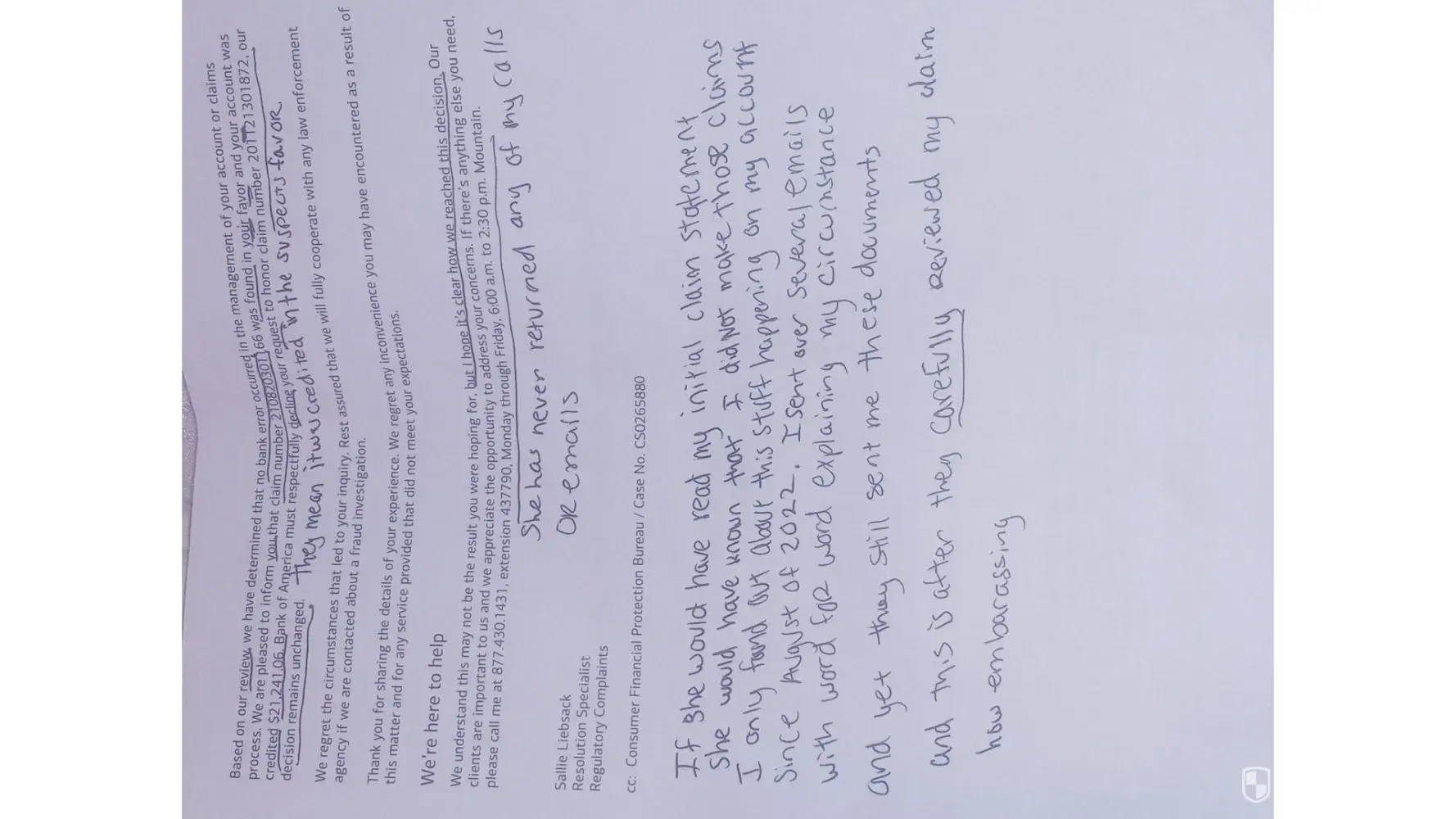I am considering getting an attorney to help me with this problem. I am frustrated and feel like I am not being heard. I would appreciate it if someone could call me to help me resolve this issue.
