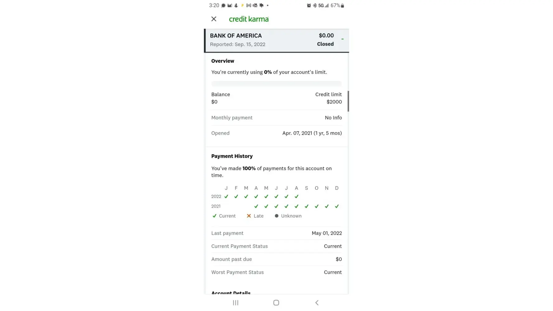 I had a credit card with bank of America for 17 months and out of the blue they notified me today that they closed my account effective September 16th, 2022. The account was paid in full, I never had a late payment with them ever. Credit Karma on equifax shows they closed my account on the 1st of September 2022. This is not even right let a alone even fair to me.