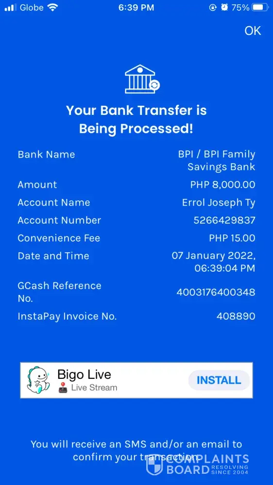 I would like to file a complaint about your account holder Errol Joseph Ty with account number [protected]. I transferred 8,000 php thru Gcash by mistake to this account and I need it reversed. This account holder is not answering my calls and messages. Please help me. I am struggling financially already and this transaction was made by mistake I need this for my daily expenses for my family, I know it's not much but this money is for medical expenses. Please help me reverse this transaction, I have attached a picture of the process here as a proof. Thank you so much!