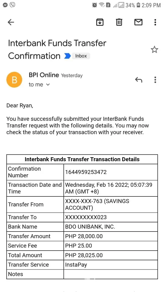 The amount was deducted from my BPI account and an email confirmation was sent confirming the transaction.
