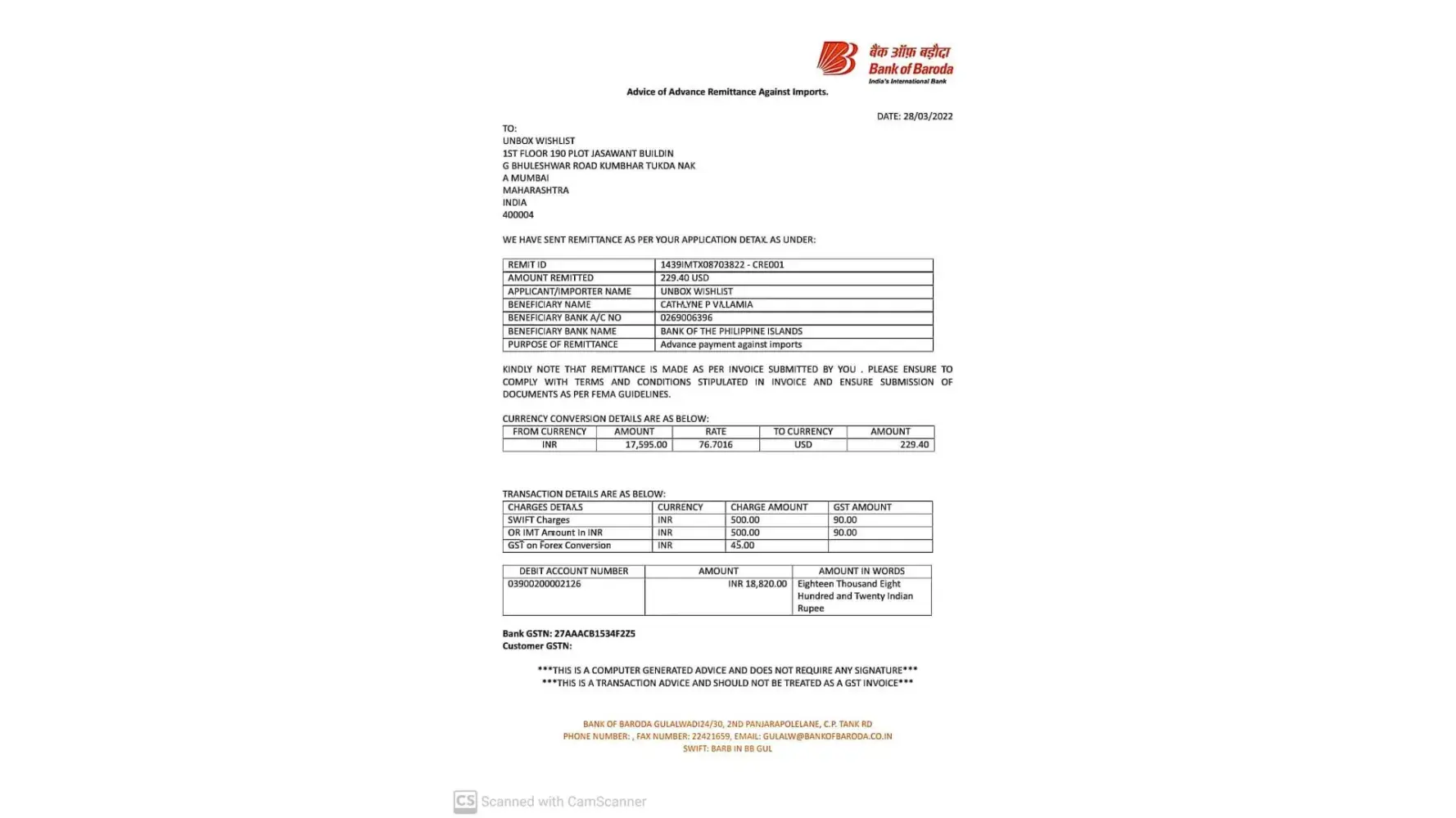 Also Attaching the invoice generated by bank of baroda at the time of advance remittance .