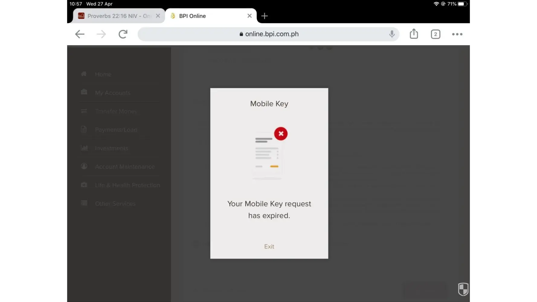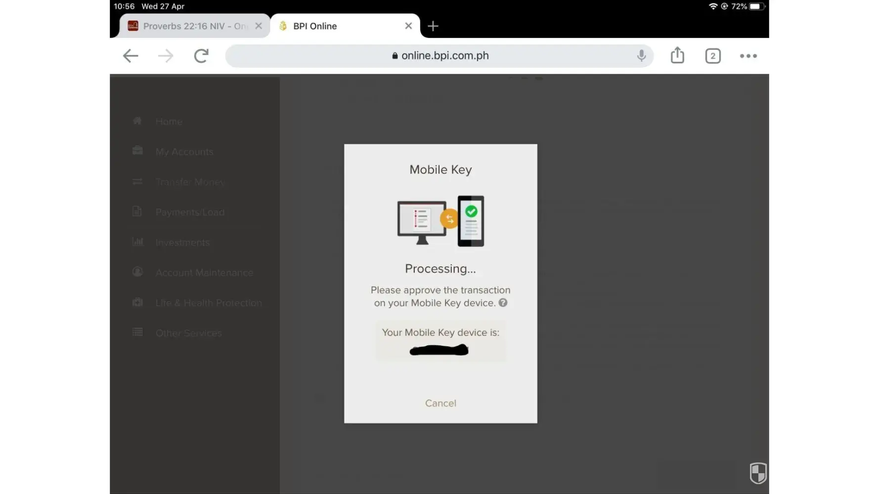 I tried several times to transfer money to a bdo account using my laptop, ipad and cellphone devices. (april 26 and 27, 2022. It was going well until I reached the part where it says, 1.) "please approve the transaction on your mobile key device". It was my assumption to receive a number through text message from bpi on my cellphone to finish the transaction as it used to be but I haven't. (please take note that i've been using my cellphone with bpi transactions for two years already.) instead I got a notice on my primary device saying 2.) "key request has expired." so, I tried to log in to my cellphone to check the issue. Again, I got the notice saying 1.) your mobile app security is our priority' for your security and convenience, you need to register this device."it then took me to 2.)"how do you want to proceed with your device registration?"giving me the option of a.) secure sms and b.) mobile key. To which I checked mobile key.