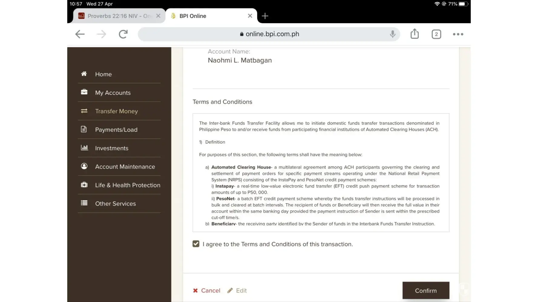 Desired outcome: I want to have my money either sent to my BDO account as per the transfer transaction or have it returned back to my BPI account immediately.