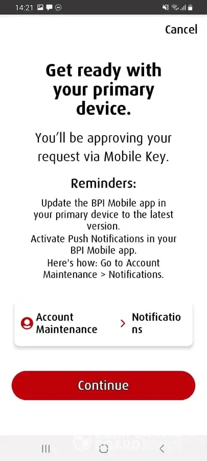 It then proceeded to 3.) get ready with your primary device. You'll be approving your request visa mobile key. Below this notice is the account maintenance and notifications and I am suppose to press 'continue" 4.) then 'processing "please approve the registration on your mobile key device"my mobile key number device is also shown below. 5.)"your mobile key request has expired." please check the attached photos of failed transaction and mobile key registration.