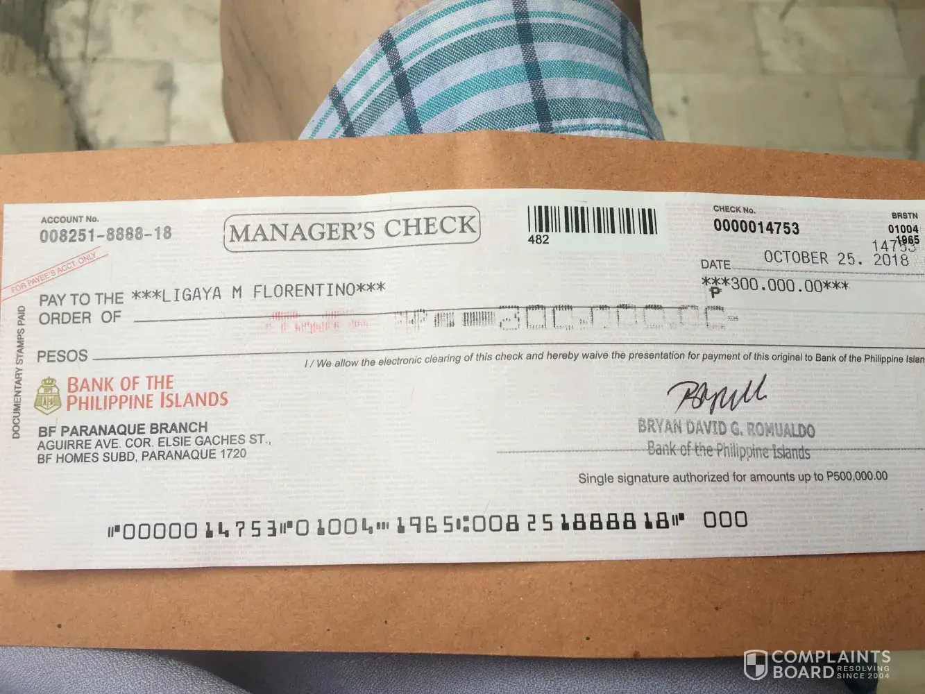 The is regarding my account No. [protected] for Ligaya and Mark Florentino opened at Branch 0318 Cubao Supercenter. On Oct. 25, 2018 I deposited a Manager's Check No. 014753 amounting to P300, 000 plus P88, 000 cash to my savings account. I was seated and counting it infront of Asst. Mgr Jossette Metrillo in BPI Sucat Branch, Pararaque City. The check was dated Oct. 25, 2018 issued to me by my prospective tenant Ms. Shekinah Luis as her one year house rent for my house in BF Homes, Paranaque City with P88, 000 cash . The amount was posted P270, 000 on my passbook which I did not notice before I left the bank because I was in a hurry and stressed due to my trip back to US on Oct. 29, 2019 . Six months after the transaction I went back home to Phil. and talked to Mrs. Metrillo, but she said she cannot remember as there were so many transactions she had handle. that day.