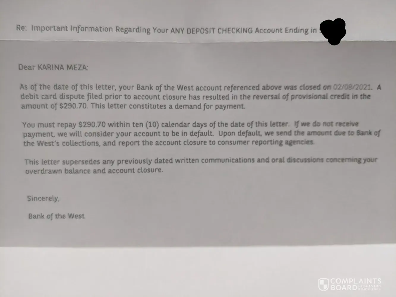 I received a letter from Bank of the West dated 05/13/2021 where it states that my account was closed on 02/08/2021 and are asking for a repayment of a provisional credit that was applied to my account prior to it being closed. In the letter I am also threatened by stating that I have 10 days to repay or they're going to report the closure to consumer report agencies.