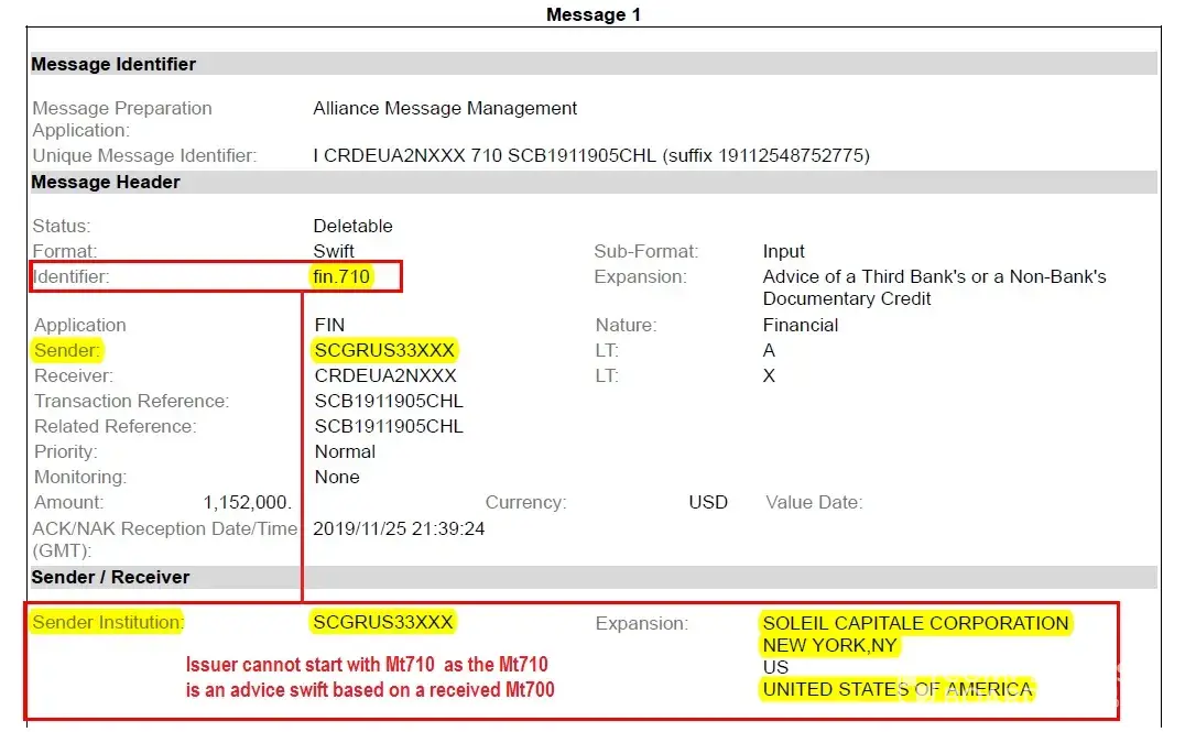 Soleil Chartered Bank as Issuer (!) sends an Mt710 as first swift, which CANNOT, as the Mt710 is an advising swift based on a received Mt700! They are aware of that being wrong, but DO NOT REIMBURSE the fees, so this is either fraud and/or embezzlement! Do not do any business with them, they send (issue!) wrong swift formats which the receiving bank...