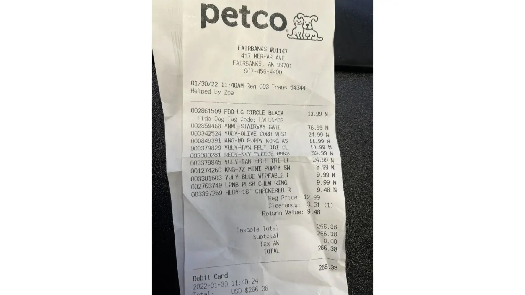 I live in Anchorage and this past weekend I took a trip to Fairbanks Alaska. On the way back to Anchorage I was picking up a puppy that I rescued from Wasilla, Alaska. While I was in Fairbanks I decided to go to the PetCo there (store #01147) and purchase a bunch of things I needed for the puppy before driving back to Anchorage (this was done in the morning...