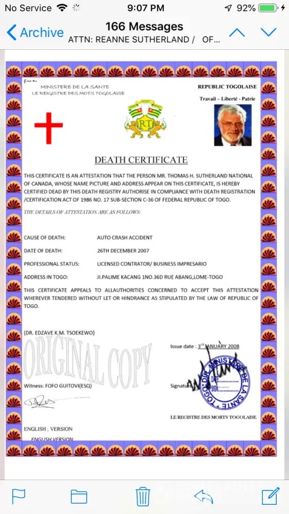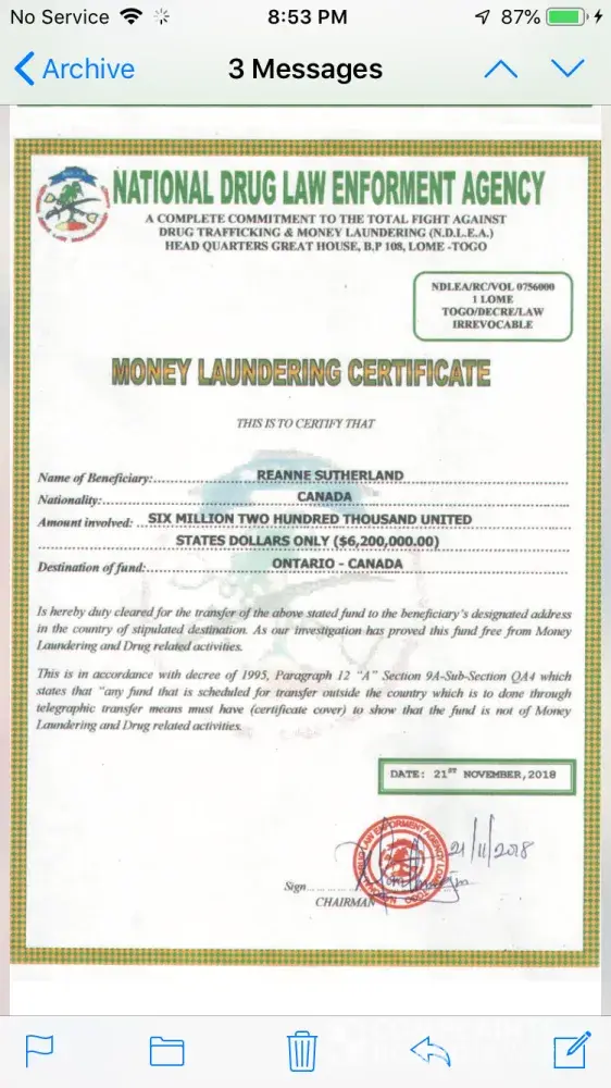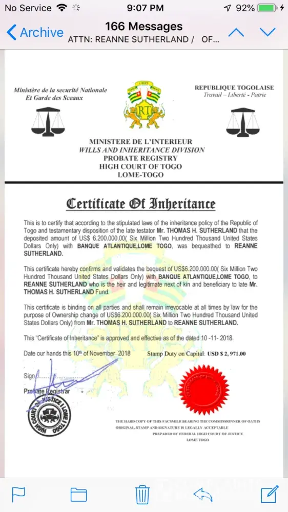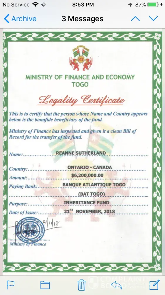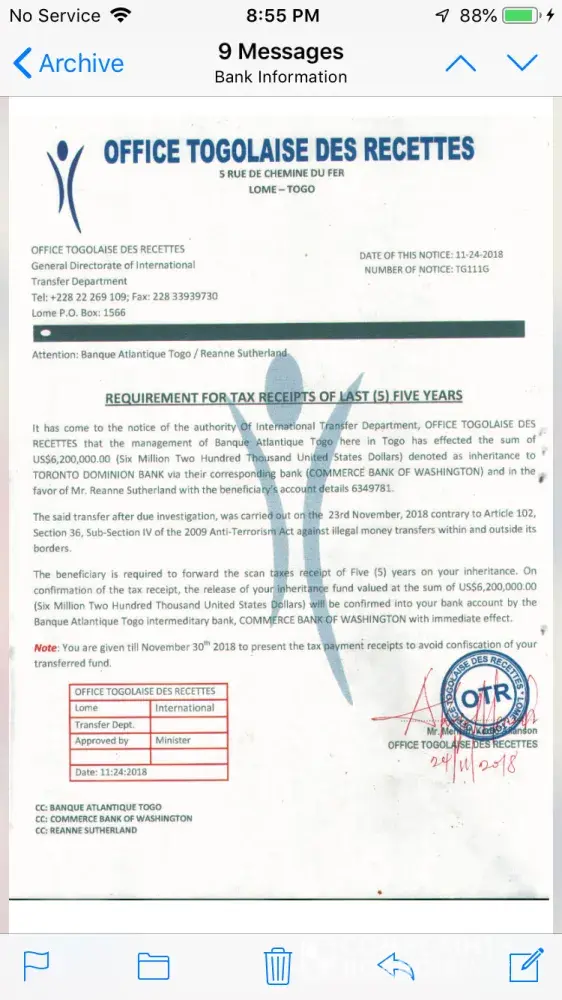 I have inherited an inheritance from my late uncle Mr. Thomas Sutherland of $6, 200, 000 US dollars. The funds are being held at the Banque Atlantique in Lomé Togo. The bank asked me to provide the necessary documents stating that I was named as next of kin. I did provide these documents. The bank was prepared to hand me the funds. They made me a bank account at their bank, they gave me the account number and pin for this account. They told me what to do to transfer the funds from this account to my account here in Canada. I did everything they said, but the PIN number was not working. So I contacted the bank, they sent me an email stating that they wanted to send the funds to me from bank to bank. I thought that was really odd, why did they change their mind like that? I gave them my banking information. Next thing you know I am contacted by the bank once again, and they announce to me that I have to pay taxes on the said funds. I was charged $500 for five years. I had to pay $2500 in taxes in order for the bank to release the funds to me. Once I paid the taxes, the bank then tells me I had to get two certificates. A money laundering certificate and a certificate of status recognition. Both of these certificates cost me $2550. Once this was done they then informed me that they had gotten a phone call from someone stating they were related to my uncle. So now the bank wanted a DNA test. I then flew all the way over there, got the DNA test done. Once again this cost me another couple thousand dollars. Finally the results came in, it said I was 19.99% of a match of DNA to my late uncle. I sent this letter to the bank, they still weren't happy. They informed that I had to get another two more certificates. This cost me another $1400. Once the bank got the last two certificates, they finally decided to send me my inheritance. But no this did not happen, I got another email from the bank stating that I would have to pay a European tax on my inheritance. The bank said they were not affiliated with them, so they had another option for me. They told me they would send me a special ATM MasterCard to which I could withdraw $25, 000 a day. The bank stated that they would pay the insurance fee on the card but I would have to pay the UPS Delivery fee and the Pin Code fee. I agreed to this thinking it shouldn't be too much. Once I agreed, the bank told me that the UPS Delivery fee was $400, so I sent the bank the $400 they needed. Then they told me that they would charge me $6200 for the Pin Code fee. O.1% of 6, 200, 000 US dollars. I said enough is enough, I did not pay for the Pin Code fee yet. I need some help. Can this bank do all of this to me? I did everything they've asked of me. I paid a lot of money to do what they wanted. I've never heard of such thing being done here like this in Canada. Having to pay taxes, having to pay for certificates, and now having to pay for a Pin Code. Please help me, I don't know what else to do. I think if I pay the Pin Code fee, they're going to ask me to do something else. It's been one thing after another with this bank. And they still want total control over the account by giving me an ATM MasterCard. I do not wish to get this card, I wish to have the funds directly deposited into my own personal bank account. Please get back to me, tell me what can I do? I also have all of the proof from the bank, I kept all of their emails. I also have attached a few photos to prove what I am saying. Please help me!