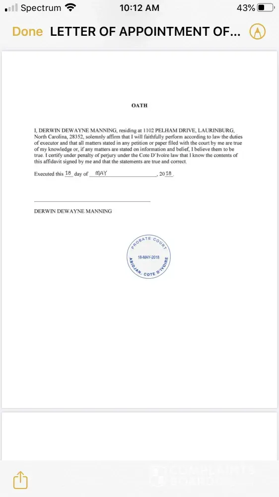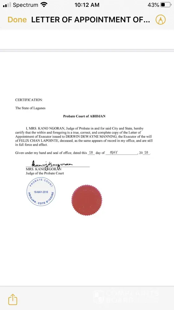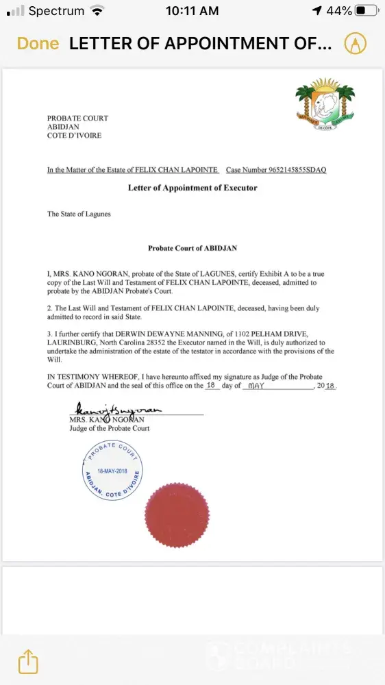 I requested to effect a Change of Ownership and Authorized Signatory of the estate belonging to my deceased family member Felix Chan Laponite of account number [protected] to my name, I was required to provide by e-mail, as an attachment, an Executor Letter issued by the probate court in Cote D'Ivoire, that clearly states I have been given the authorization to act on behalf of the decedent's estate as an executor. The bceao agency demanded me to provide a Certificate of Ownership and an International Fund Transfer Permit and non citizen. For the Certificate of Ownership, that as the Letter of Executor can go in place of that. And for the International Fund Transfer Permit I received that from Minister Finance. My last step was verification from Security Department at your bank. I have completed all steps and was told by the officer ( Mrs. Emeline Yamoussou, )