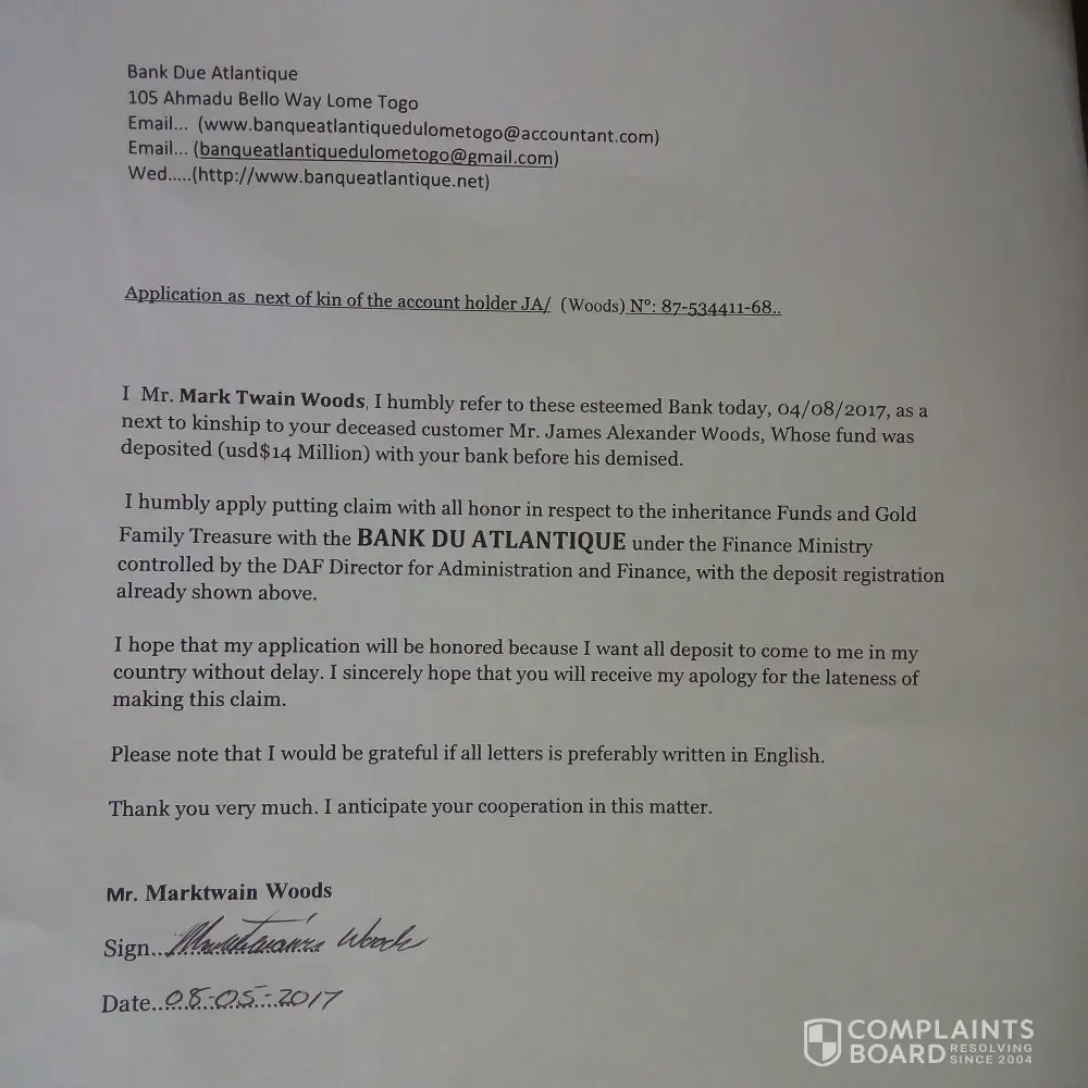 I Marktwain Woods, humbly refer to these esteemed bank today, o8-08-2017, as a next of kinship to your deceased customer Mr. James Alexander Woods. Whose funds was deposited(USD$14Million)with your bank before his demised.I humbly apply putting claim with all honor in respect to the inheritance funds and Gold family Treasure with the BANK DU ATLANTIQUE under the Finance Ministry controlled by the DAF Director for Administration and finance, with the deposit registration already shown above.
