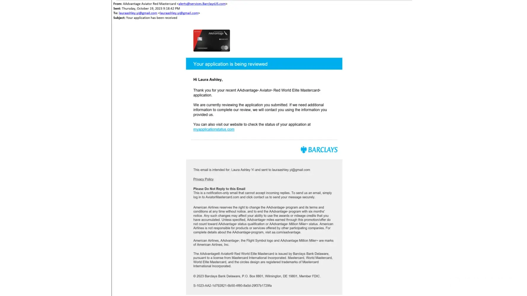 On 10/19/2023, I applied for a credit card and received confirmation; see attached, addressed Hi Laura Ashley, Thank you for your recent AA... When I received the credit card, my name was Laura, missing the Ashley. On 11/21/2023, I contacted Barclays to have my misspelled first name corrected to what I provided on the application, my legal name. After being transferred multiple times, Magail NCSMRU informed me I needed to provide documentation since my request was to change more than 2 letters. She confirmed my credit report reflects my name as Laura Ashley, however, she claimed the online application reflects Laura, which is inaccurate as I received the confirmation from Barclays confirming I entered my name as Laura Ashley.