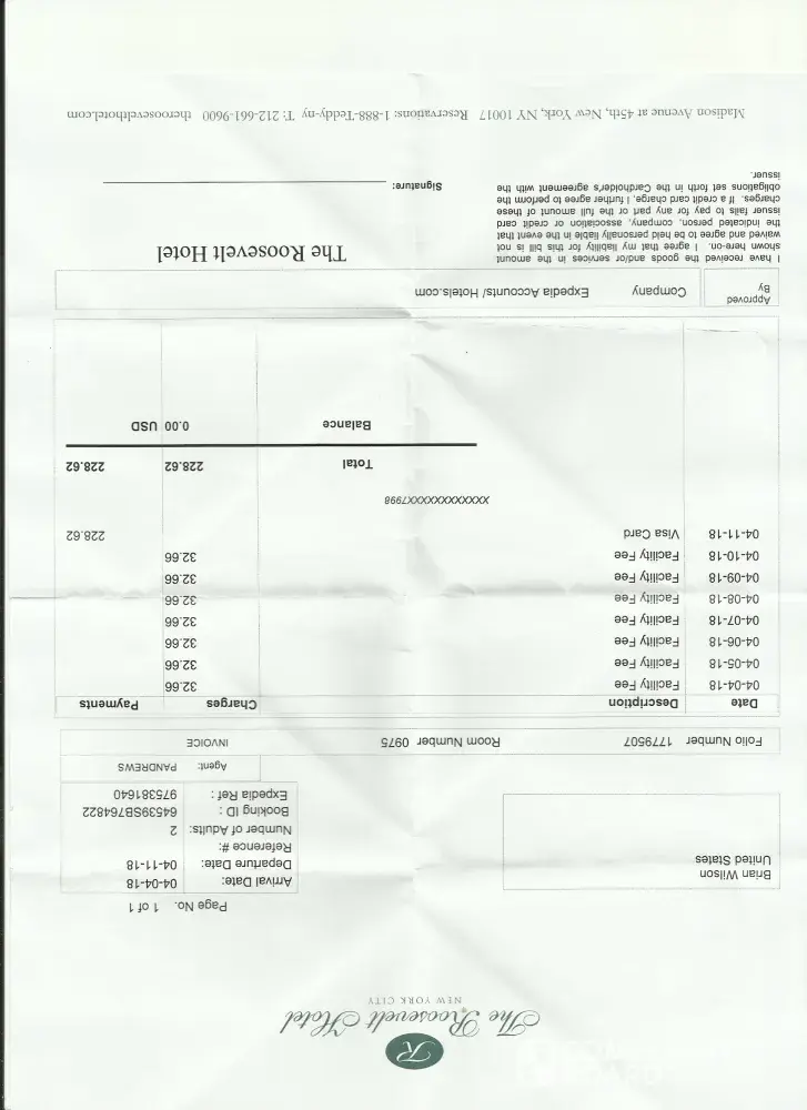When we arrived at the reception of the Roosevelt Hotel, New York on 4 April 2018 we were told that we had to pay a facility charge of 32.99 dollars per day for internet connection, gym use, being able to make local calls and they gave us vouchers for 10% off at their restaurant. The hotel said that as we were an Experia booking we had to pay this and this was disclosed when the booking was confirmed. We had not been told anything about this facility charge when we booked the holiday and although we wanted the internet connection, we had no intention of using the gym, making local calls or eating in their expensive restaurant. We had to pay £167.32 for the facility charges for 4-11 April 2018 when we left the hotel for just for using the wi fi. There is no mention of the hotel's daily facility charge in the accommodation voucher ref. 7392373 we were given. We feel that we were badly let down by Barrhead Travel and the company should refund us the £167.32 we had to pay for something we should have been told about at the time of booking. If we had of been told about the hotel's facility charge we would have chosen a different hotel with free wi fi. Barrhead Travel is responsible for informing its customers of all costs and charges they will incur especially when these would be in addition to the total cost of the holiday which had already been paid and they failed to do this.
