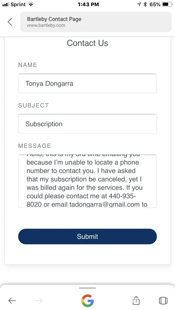 Hello, I have tried multiple times to contact this company to cancel, yet the number is no longer working and only contact us through their site. Not even an email is found. I have follow the site and contacted, yet still billed $30 a month. I have screen shots of my contact I've sent as well. I'm at my ends with this situation. I'm not sure if you can provide me with another source of contact? Perhaps others have had the same issue as well. Any help would be greatly appreciated thank you. [protected]@gmail.com
