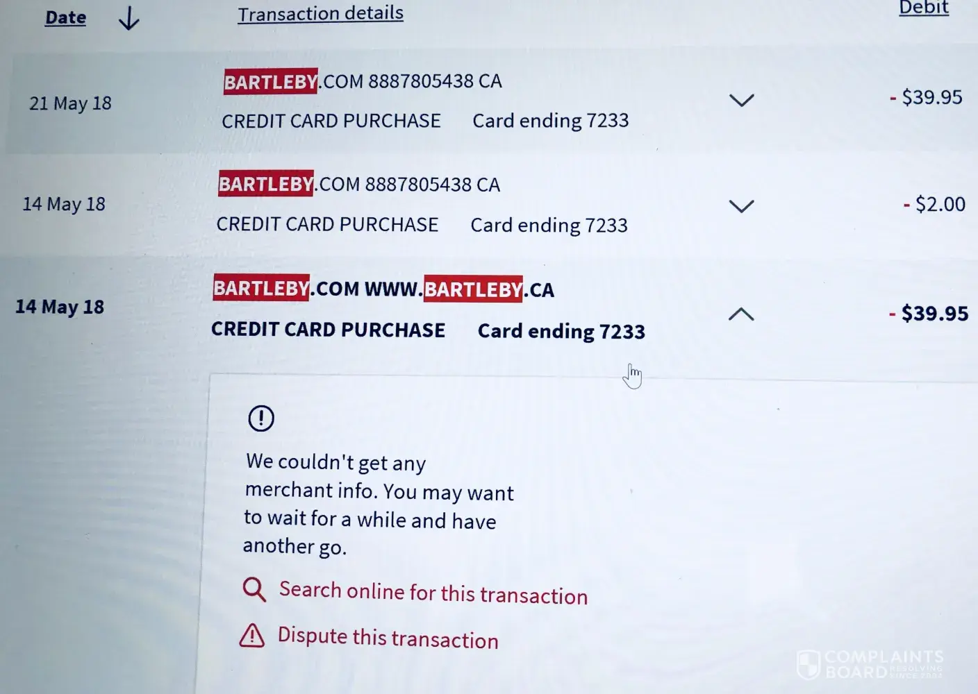 I have been debited for two unwarranted monthly subscriptions in the amount of $39.95 from Bartleby's on the 14th May 2018 and again on 21st May 2018 . Another debit of $2.00 was debited on the 14 th May. I received confirmation of my unsubscribed account via email but they are still debiting me.