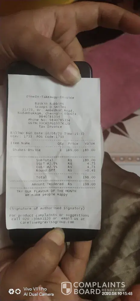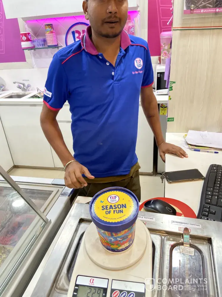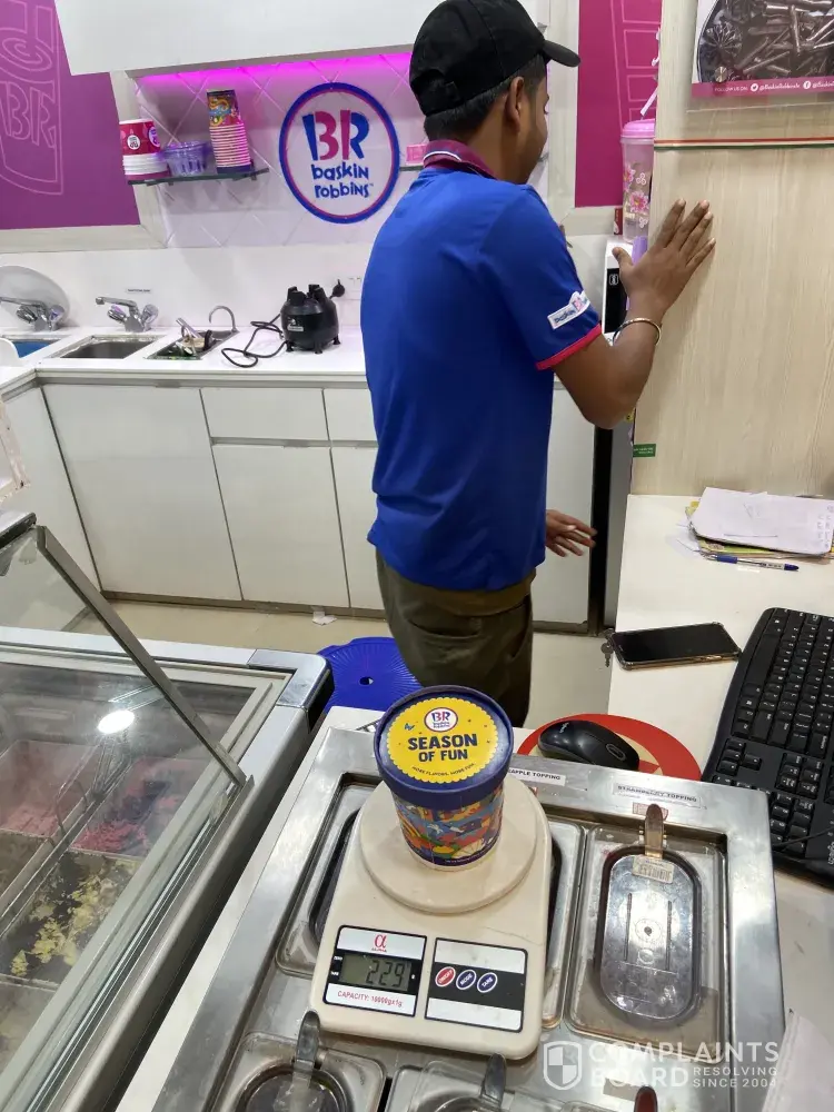 Yesterday on 21.10.19 around 9.30 pm through food delivery partner swiggy I had ordered a 700 ml california almond ice cream tub. On receiving the same from the southern avenue outlet I found that the quantity given is much less. I had my doubts and hence rushed to the outlet and asked them to weigh the ice cream. It appeared that the weight of the tub was only 222 grams. I had paid for 700 ml of ice cream. I was also told that for 700 ml the gram conversion as per baskins official chart was only 368 gram. This was also bizarre and I asked them to show a proper chart from baskin whereby they can show such details, since they are charging per ml, but delivering per gram and hence cheating on quantity.