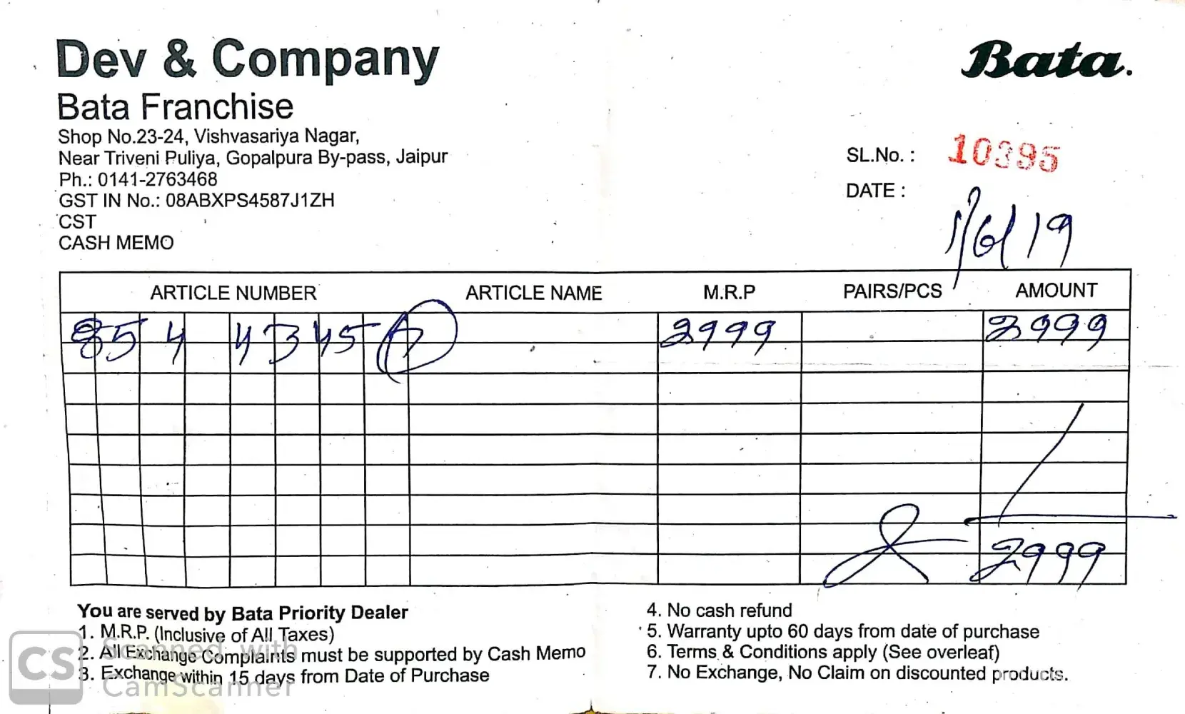 I was Buy Shoes (Rs. 2499) & slipper (Rs. 999) from BATA showroom before 6 month.