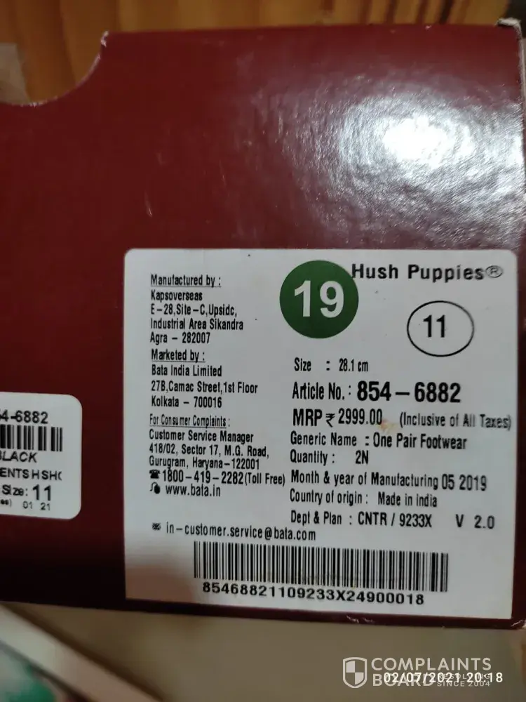I am in need of your sincere support as the product I have purchased is proved to be of inferior quality. I want to mention that I had purchased Hush Puppies Shoes worth Rs. 2999/- from your retailer named ' Dev & Co', Jaipur on 01/06/2019 (snapshot attached) and to my utmost disappointment I found that my shoes got discolouration (snapshot attached) within 03 months of purchase, for this I contacted the seller and he raised a complaint @ Bata customer care on 08/11/2019 & 14/11/2019 twice along with physical item i.e. shoes (as per seller) and now I had been told that customer care has given no response on the complaint I have generated against the quality of the product given.