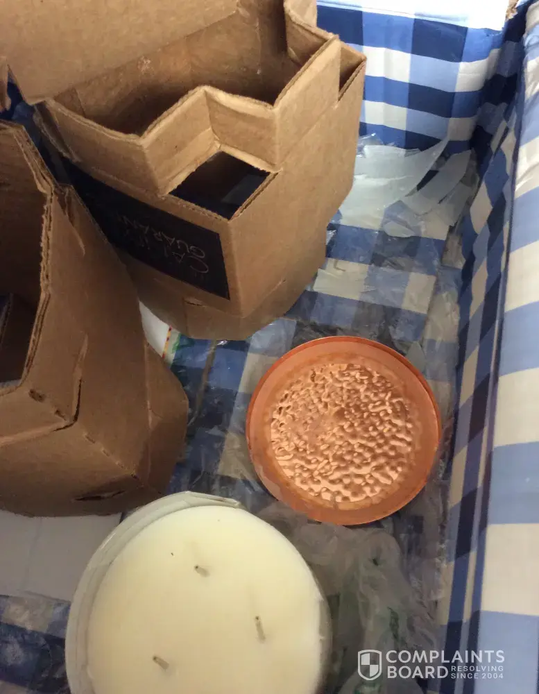 Damaged candle, tried email and 800number requested a callback received call back I answered immediately and was placed back in que with very lengthy que. not customer friendly. Have photos of candle in shipping box. Just want a response from someone.