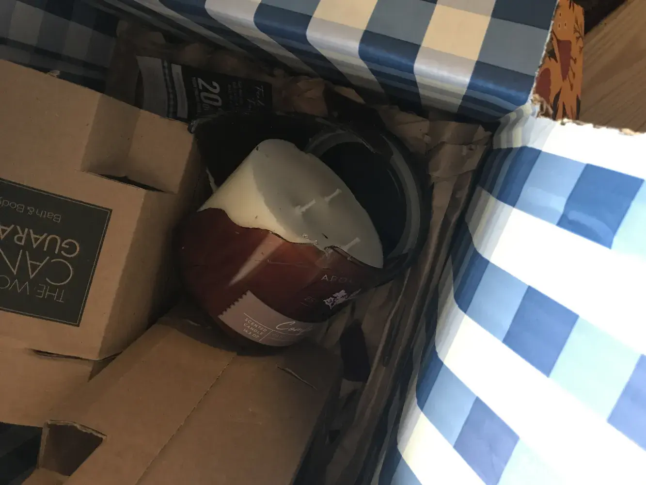 I had an online order and the comfort three-wick candle totally shattered into pieces, leaving glass in the box. It’s absolutely not safe, and I would like a refund on the candle please. I added a photo so you can see what I’m talking about.