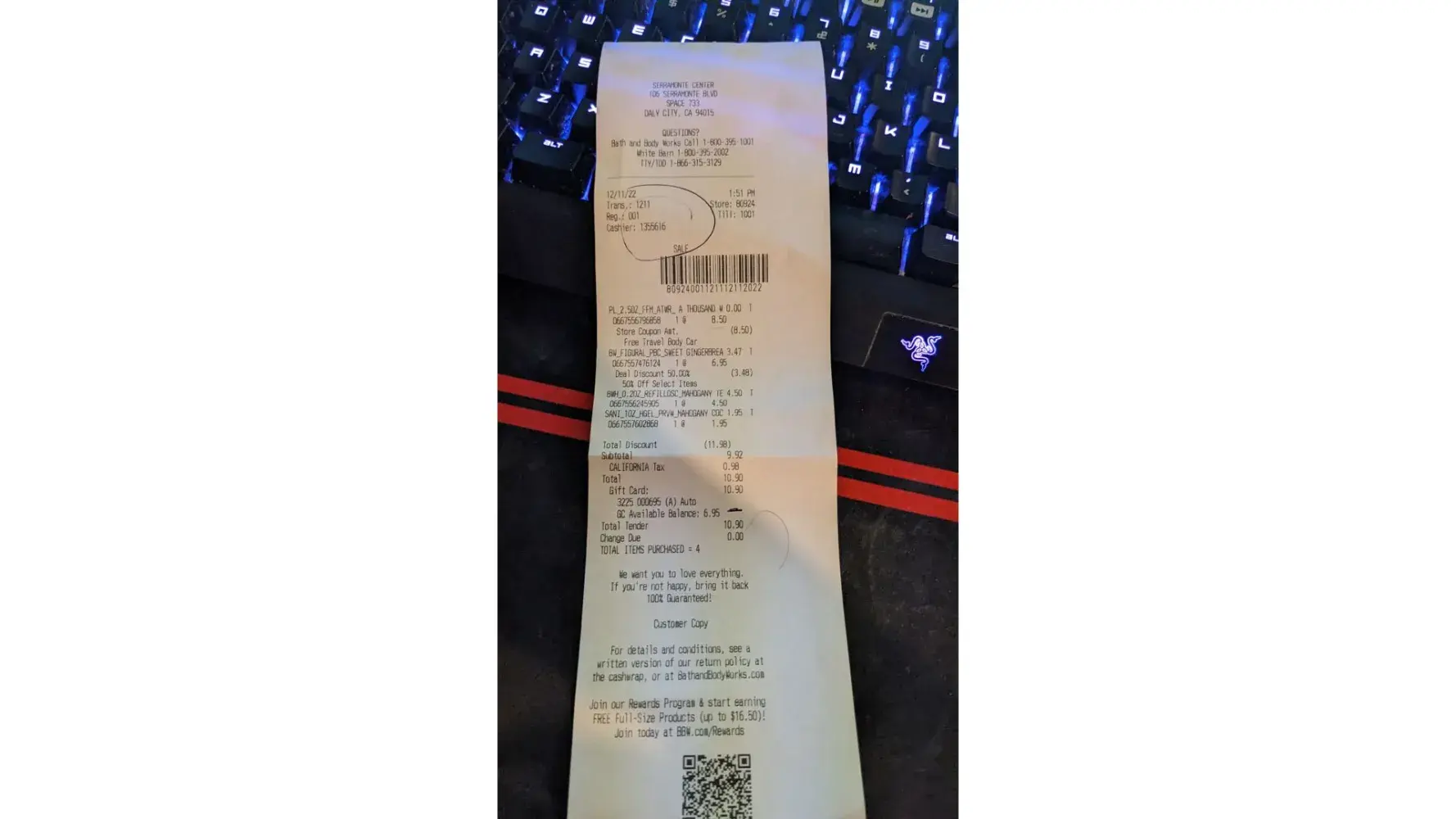 My transcation is 1211 store 80924 dec 11 2022 1:51 pm total $10.90