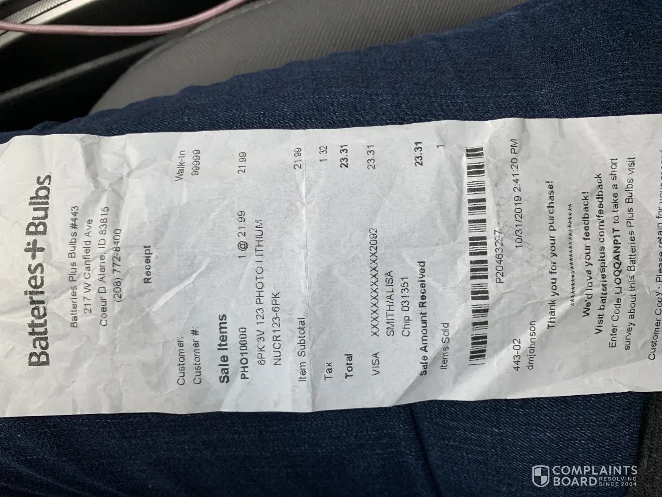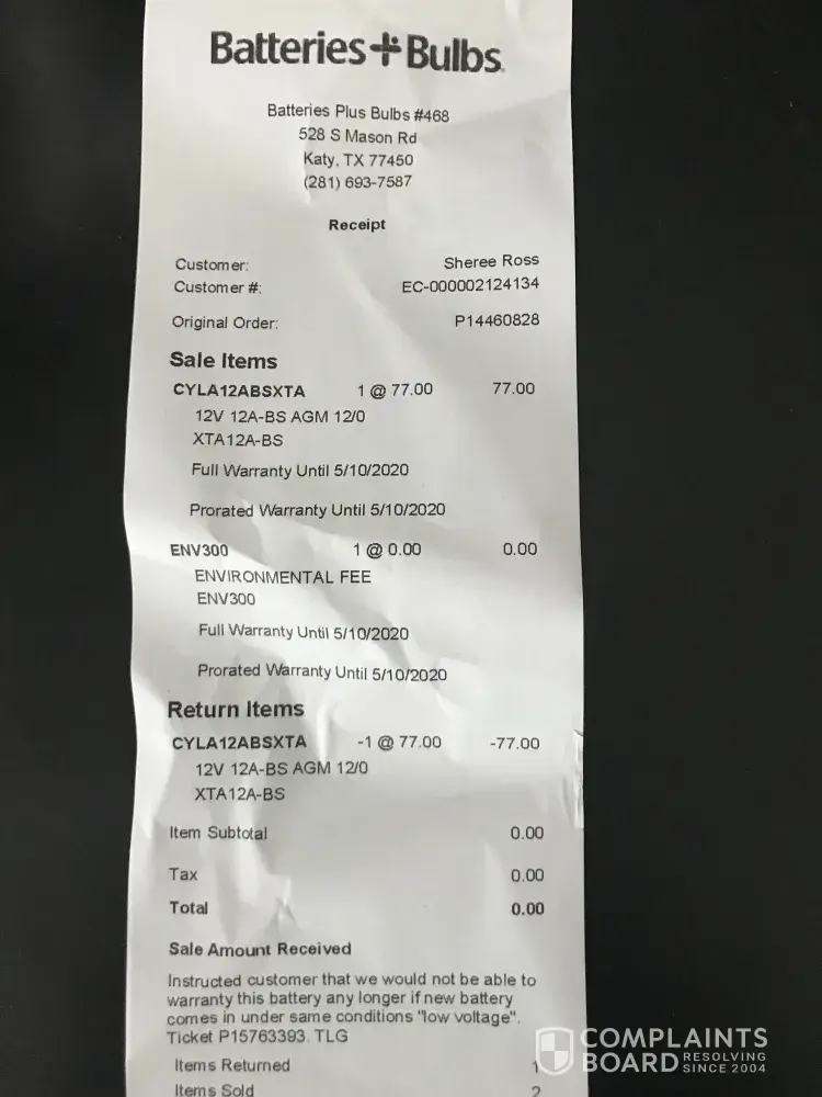 Batteries+Bulbs #997 18541 Hawthorne Blvd. Torrance, CA 90504 [protected] Rick Taylor #EC-[protected] #EC0031705190 Manager Ron called left message to pick-up battery. Go to pick -up battery ordered online at store 5/27/2020 he then quickly tells me they don't really have the battery I order but I can have this other battery made in USA for...