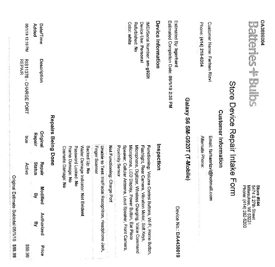 I was having the battery replaced to send the phone with my 11 year old son who is taking a trip to Indiana for the summer. I have proof of purchase within the last 30 days of T-Mobile (3-month pre-paid cellular service), Cellular Zone receipt (screen replacement) and Amazon case purchase. None of that would have been necessary for a phone that was inoperable. I also can show the mobile service use history from T-Mobile showing that the phone was 100% operable and in-service on their network prior to me entering the Garland store location on 6/8.