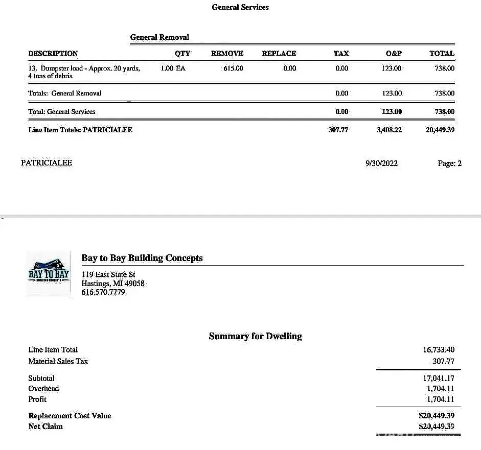 We contracted with Bay to Bay on May 23, 2022 after being contacted by Mr. Saeman, owner of Bay to Bay Building Concepts, LLC. He promised to have everything back to new by June. They finally got a roof put on the home in late July and proceeded to charge us double what it should have cost and what they quoted for the home roof AND metal shed roof! We got the line items and invoice from our insurance company and noted that several of the line charges were for items never done and material never put on our home. We do not have any downspouts or gutters, which we were charged for, We were double billed on dumpster also and they did not reset our dish satellite... we paid Dish to come and reset it as it was left hanging off the roof along with a lot of garbage from the workers that were here a total of 9 hours! So many unanswered calls, texts, emails, etc... they do not call you back at all. We asked Elizabeth for an invoice since we never received one... it has not been sent in almost a year. Our insurance company thinks that this company never intended for us to see the false line items that were tacked on to the inflated invoice. Our home is barely 1100 sq ft ranch and we had three other estimates done... none of these three were over $9,000.000. Bay to Bay wants almost $21,000.00! Our insurance agreed to an amount of almost $13,000.00 and we were okay with that even though the roof was not worth that amount for what was done, they still refuse to return the balance of our deposit of almost $19,000.00. We just wanted our $6,000.00 for the purchase of siding returned after they cancelled our contract. We did not want it cancelled and I have an email proving this.