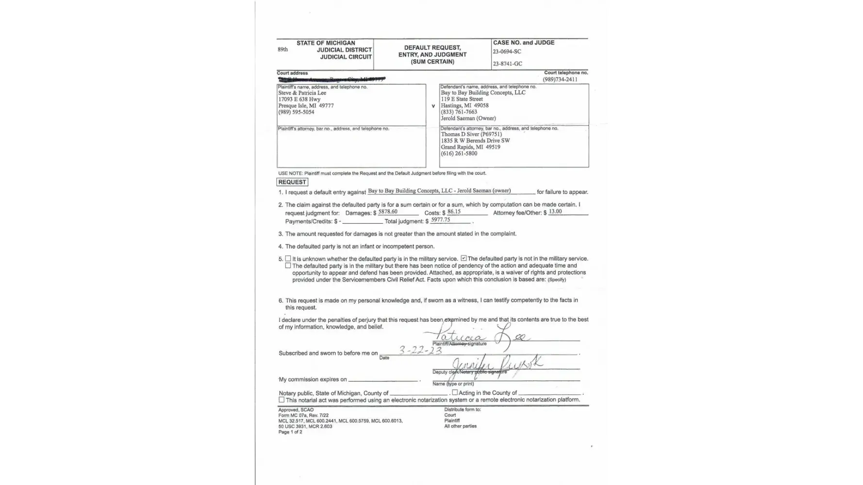 We just want our deposit for the siding returned and court fees which continue to mount trying to get them to comply with the court.