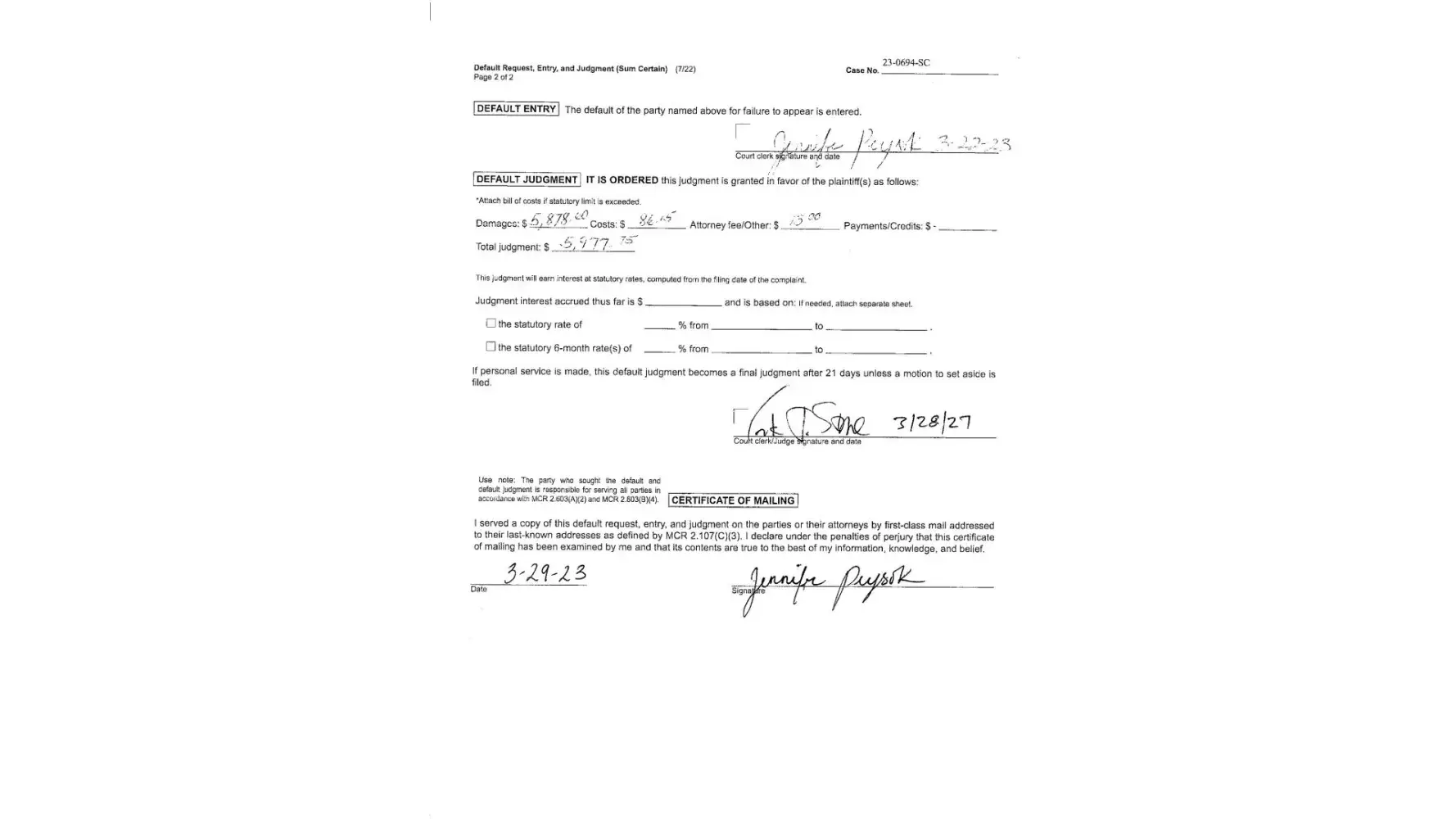 Desired outcome: Payment of Courts final judgement as ordered.